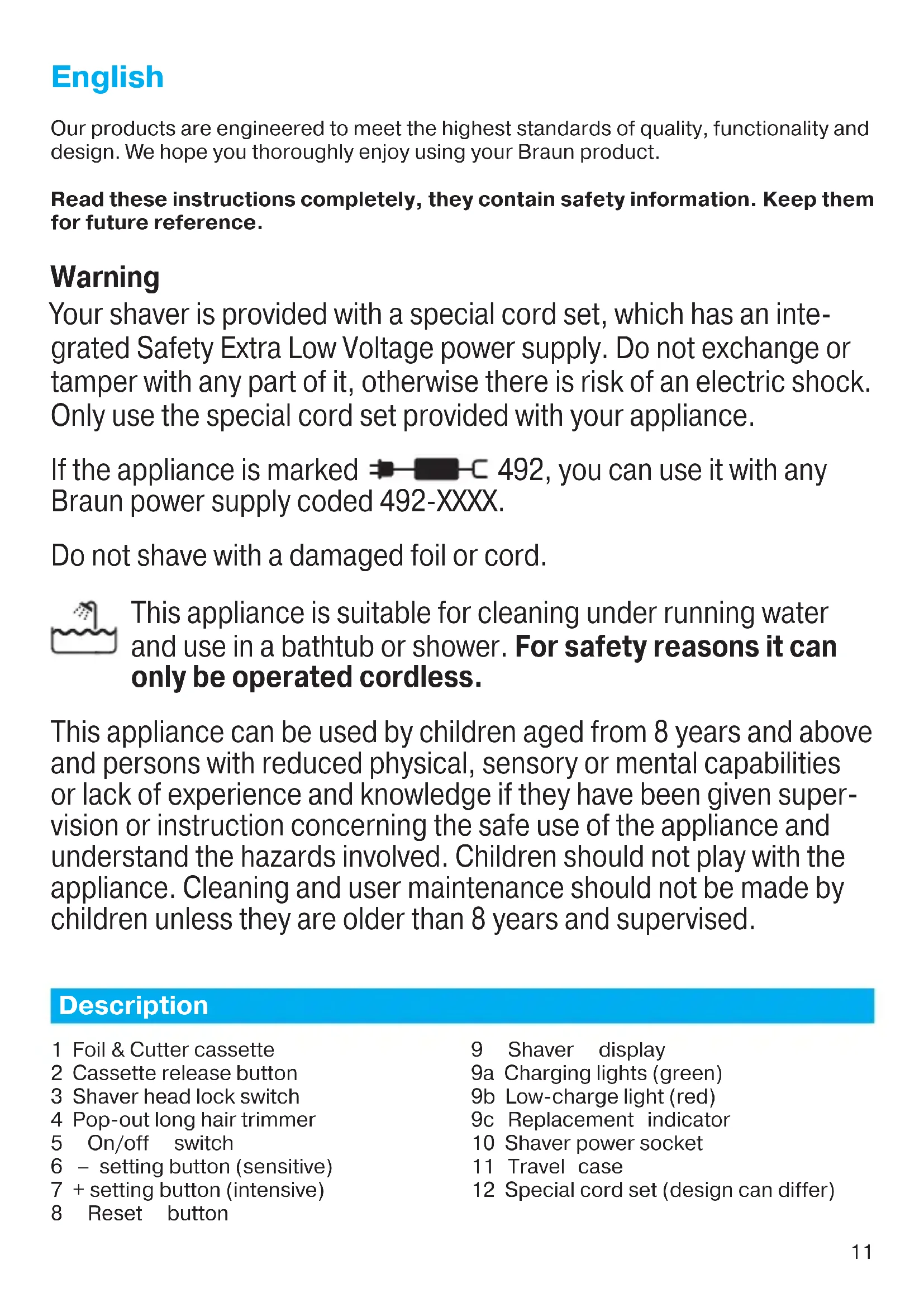 Personalizing your shaver By holding down the accelerator button –/+ (6) or (7) you can adjust the shaving power to your individual needs in the different areas of your face from sensitive to intensive. The pilot light in the on/off switch (5) changes within the following range: (–) sensitive shave - light blue - dark blue - green (+) intensive shave 91153500_Series_7-8_Solo_EURO_S6-140.indd 1291153500_Series_7-8_Solo_EURO_S6-140.indd 12 28.11.16 13:4228.11.16 13:42 CSS APPROVED Effective Date 30Nov2016 GMT - Printed 04Jan2017 Page 11 of 13913 For a thorough and fast shave we recommend the green (intensive) setting. When switching on next time, the last used setting will be activated. Cleaning Regular cleaning ensures better shaving performance. Rinsing the shaver head under running water after each shave is an easy and fast way to keep it clean: Cleaning under running water: