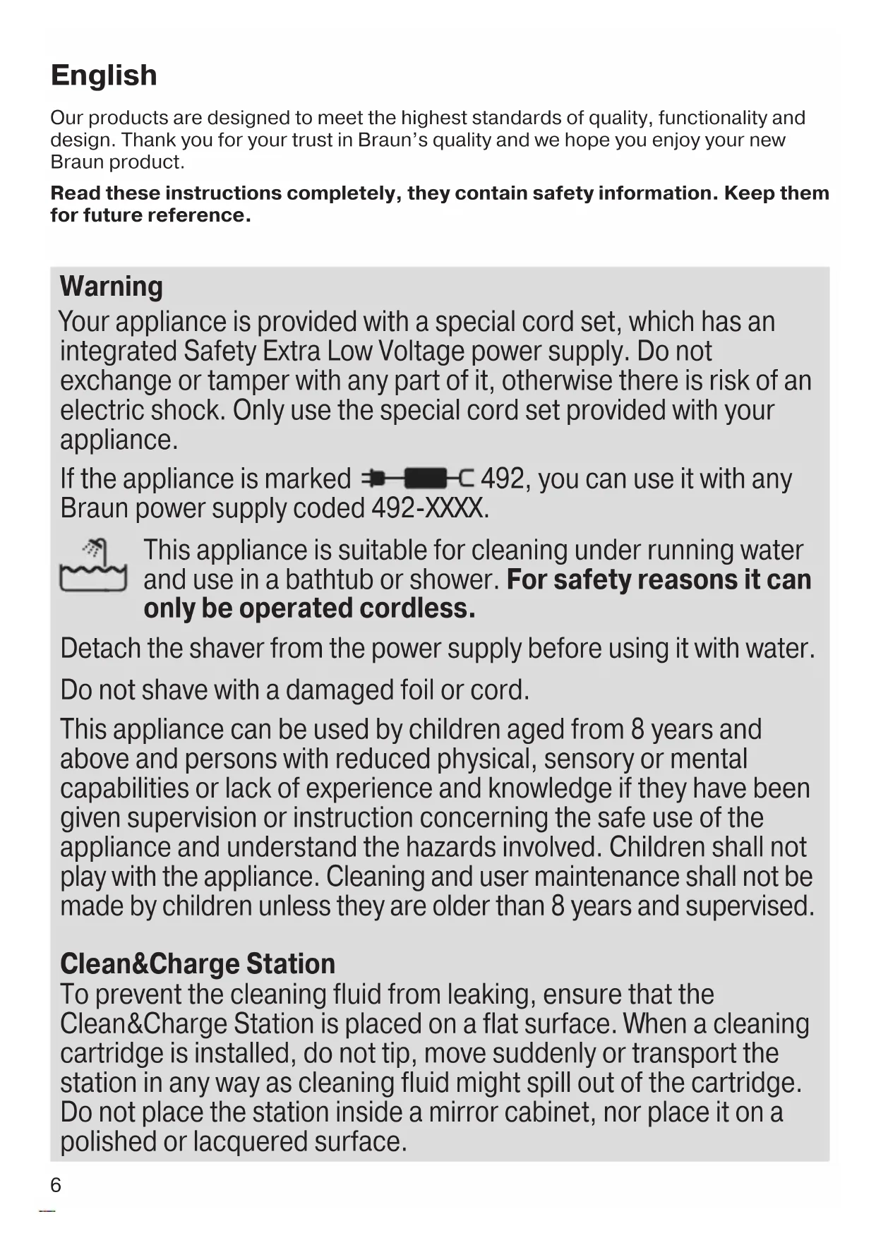 91092674_Series_5-2cc_wd_CEEMEA_S5.indd 191092674_Series_5-2cc_wd_CEEMEA_S5.indd 1 09.11.16 10:3809.11.16 10:38 CSS APPROVED Effective Date 30Nov2016 GMT - Printed 05Apr2017 Page 5 of 1326 English Our products are designed to meet the highest standards of quality, functionality and design. Thank you for your trust in Braun’s quality and we hope you enjoy your new Braun product. Read these instructions completely, they contain safety information. Keep them for future reference. Warning Your appliance is provided with a special cord set, which has an integrated Safety Extra Low Voltage power supply. Do not exchange or tamper with any part of it, otherwise there is risk of an electric shock. Only use the special cord set provided with your appliance. If the appliance is marked 492, you can use it with any Braun power supply coded 492-XXXX. This appliance is suitable for cleaning under running water and use in a bathtub or shower. For safety reasons it can only be operated cordless. Detach the shaver from the power supply before using it with water. Do not shave with a damaged foil or cord. This appliance can be used by children aged from 8 years and above and persons with reduced physical, sensory or mental capabilities or lack of experience and knowledge if they have been given supervision or instruction concerning the safe use of the appliance and understand the hazards involved. Children shall not play with the appliance. Cleaning and user maintenance shall not be made by children unless they are older than 8 years and supervised. Clean&Charge Station To prevent the cleaning fluid from leaking, ensure that the Clean&Charge Station is placed on a flat surface. When a cleaning cartridge is installed, do not tip, move suddenly or transport the station in any way as cleaning fluid might spill out of the cartridge. Do not place the station inside a mirror cabinet, nor place it on a polished or lacquered surface. 91092674_Series_5-2cc_wd_CEEMEA_S6-132.indd 691092674_Series_5-2cc_wd_CEEMEA_S6-132.indd 6 23.11.16 15:4123.11.16 15:41 CSS APPROVED Effective Date 30Nov2016 GMT - Printed 05Apr2017 Page 6 of 1327 The cleaning cartridge contains a highly flammable liquid so keep it away from sources of ignition. Do not expose to direct sunlight and cigarette smoking nor store it over a radiator. Do not refill the cartridge and use only original Braun refill cartridges. Shaver 1 Foil & Cutter cassette 2 Cassette release button 3 MultiHeadLock switch 4 On/off switch 5 Shaver display 5a Lock symbol (travel lock) 5b Charging segments 5c Cleaning indicator 5d Battery symbol 6 Long hair trimmer 7 Shaver-to-station contacts 8 Release button for long hair trimmer 9 Shaver power socket 10 Special cord set (design can differ) 11 Protection cap* 12 Travel case*
