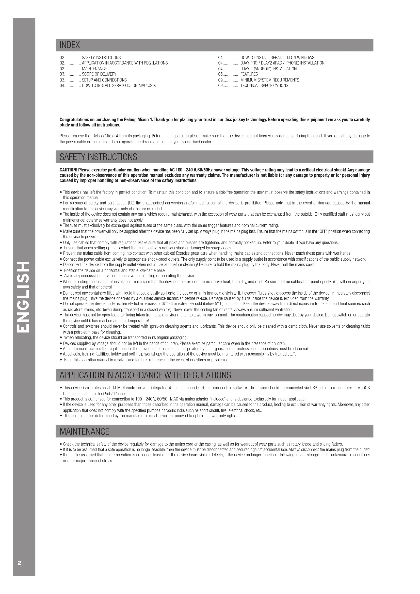 Congratulations on purchasing the Reloop Mixon 4. Thank you for placing your trust in our disc jockey technology. Before operating this equipment we ask you to carefully study and follow all instructions.