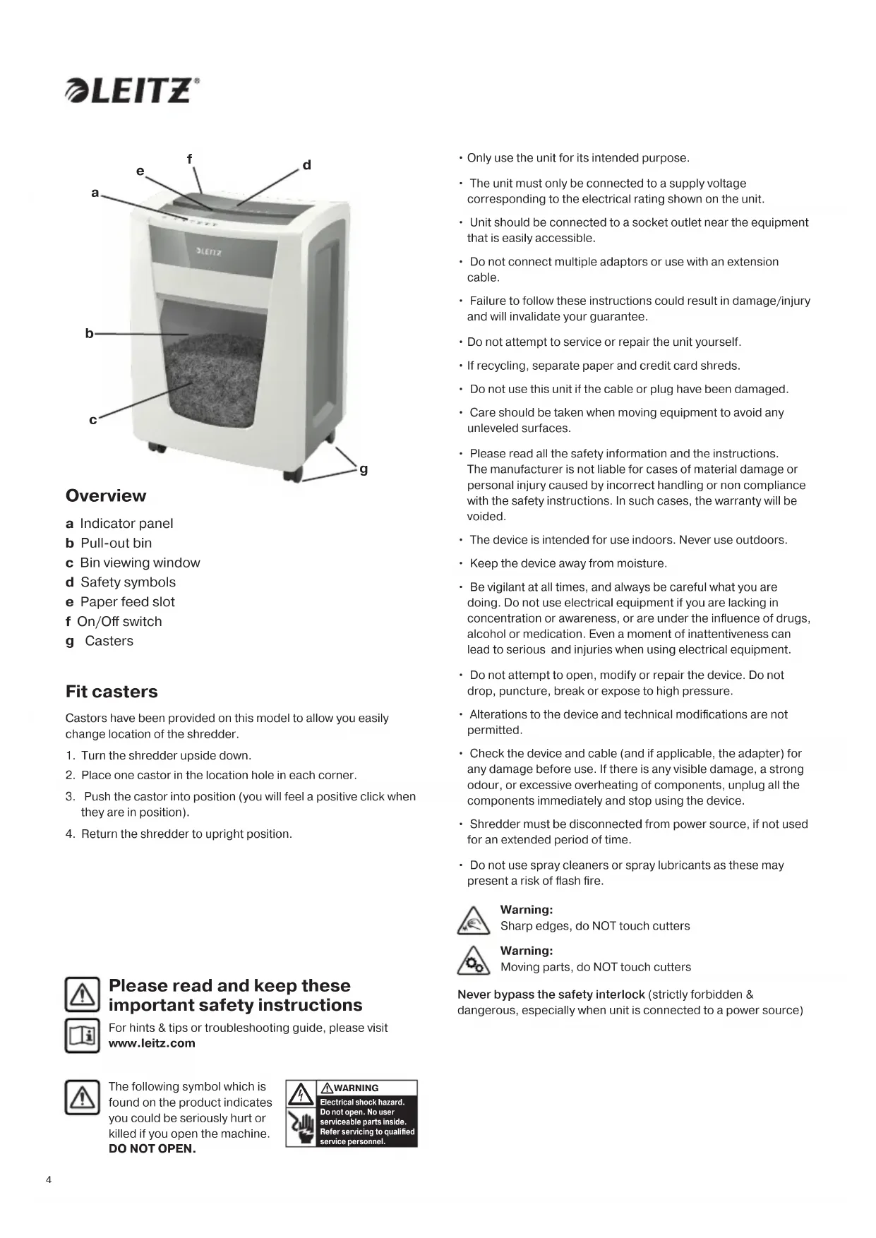 Please read and keep these important safety instructions For hints & tips or troubleshooting guide, please visit www.leitz.com Overview a Indicator panel b Pull-out bin c Bin viewing window d Safety symbols e Paper feed slot f On/O switch g Casters