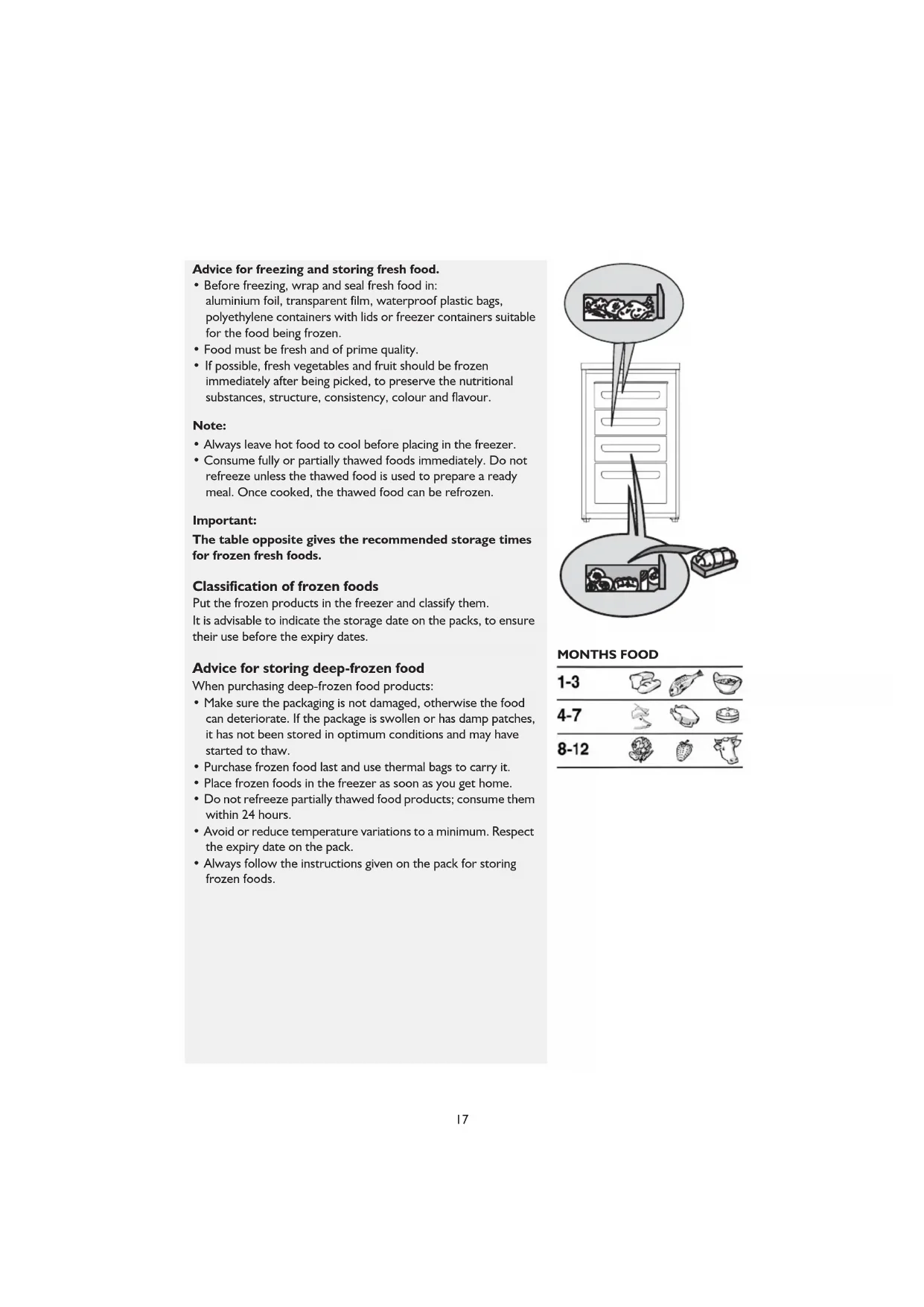 - Consume fully or partially thawed foods immediately. Do not refreeze unless the thawed food is used to prepare a ready meal. Once cooked, the thawed food can be refrozen. Important: The table opposite gives the recommended storage times for frozen fresh foods. Classification of frozen foods Put the frozen products in the freezer and classify them. It is advisable to indicate the storage date on the packs, to ensure their use before the expiry dates. Advice for storing deep-frozen food When purchasing deep-frozen food products: