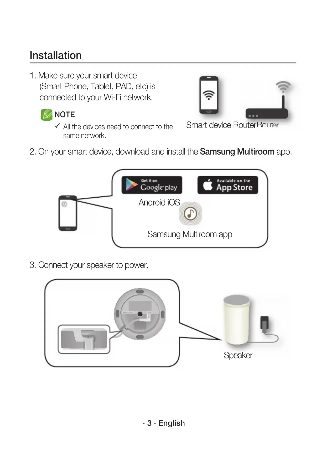 WAM1501-EN_15p-ENG-QSG-0901.indd 01 2016-09-01 4:53:18· 1 · English Speaker Main Features Wi-Fi connection is recommended for this speaker. Provides a wide range of sound sources, Internet radio available, and supports group play with multiple connections or stereo sound feature. Features Wi-Fi Bluetooth Multiroom feature Connect multiple devices at once. One device connection Music service Variety of music services available with the Samsung Multiroom App.