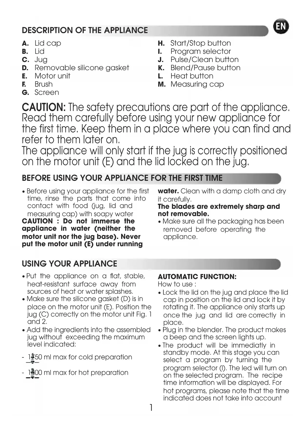 - Before using your appliance for the first time, rinse the parts that come into contact with food (jug, lid andmeasuring cap) with soapy water CAUTION : Do not immerse theappliance in water (neither themotor unit nor the jug base). Neverput the motor unit (E) under runningwater. Clean with a damp cloth and dryit carefully.The blades are extremely sharp andnot removable.• Make sure all the packaging has beenremoved before operating theappliance. CAUTION: The safety precautions are part of the appliance. Read them carefully before using your new appliance for the first time. Keep them in a place where you can find and refer to them later on. The appliance will only start if the jug is correctly positioned on the motor unit (E) and the lid locked on the jug.