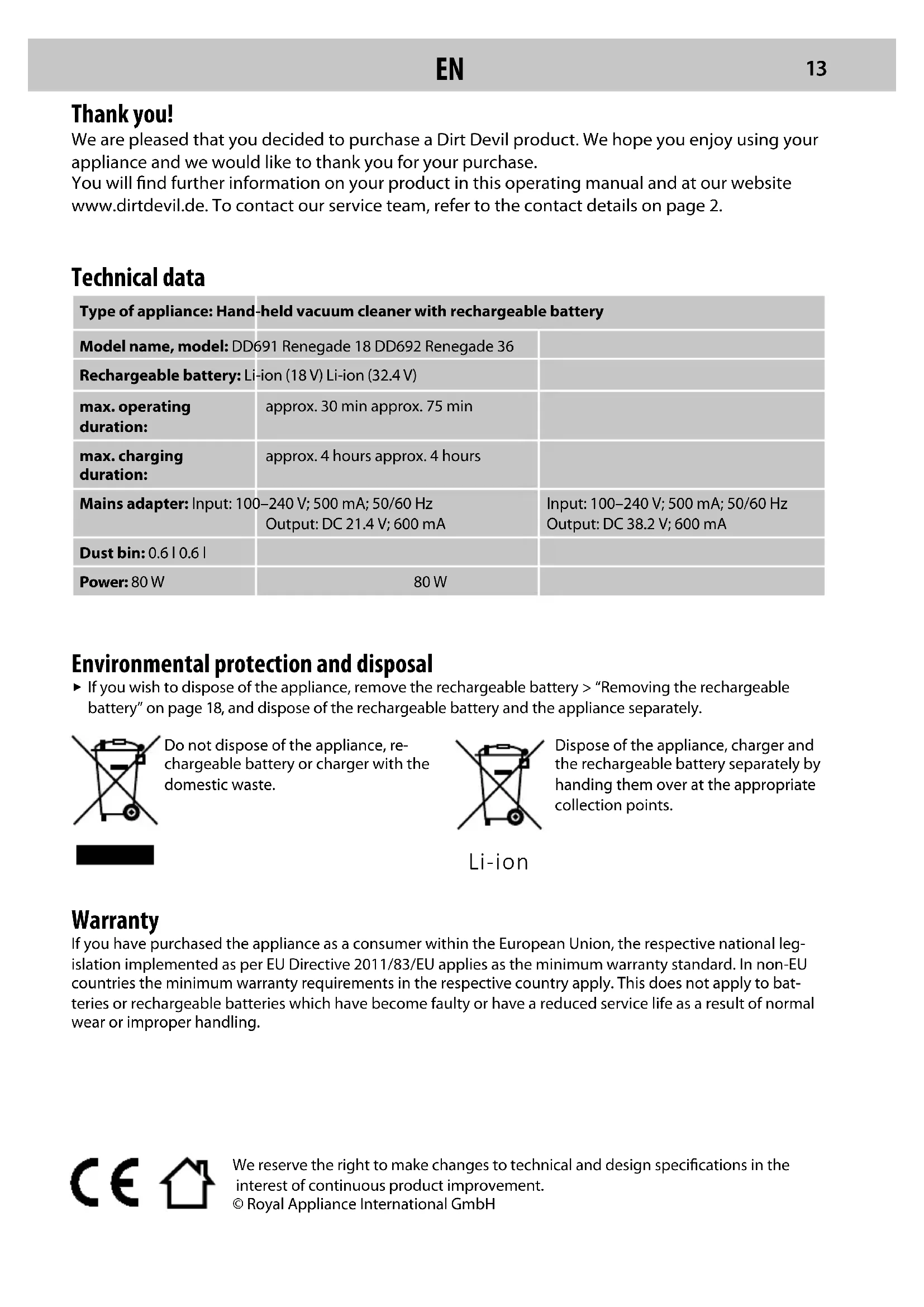 If you wish to dispose of the appliance, remove the rechargeable battery > “Removing the rechargeable battery” on page 18, and dispose of the rechargeable battery and the appliance separately.Do not dispose of the appliance, re-chargeable battery or charger with the domestic waste.Dispose of the appliance, charger and the rechargeable battery separately by handing them over at the appropriate collection points. Warranty If you have purchased the appliance as a consumer within the European Union, the respective national leg-islation implemented as per EU Directive 2011/83/EU applies as the minimum warranty standard. In non-EU countries the minimum warranty requirements in the respective country apply. This does not apply to bat-teries or rechargeable batteries which have become faulty or have a reduced service life as a result of normal wear or improper handling. Li-ion We reserve the right to make changes to technical and design specications in the interest of continuous product improvement.© Royal Appliance International GmbH Technical data Type of appliance: Hand-held vacuum cleaner with rechargeable batteryModel name, model: DD691 Renegade 18 DD692 Renegade 36Rechargeable battery: Li-ion (18 V) Li-ion (32.4 V)max. operating duration:approx. 30 min approx. 75 minmax. charging duration:approx. 4 hours approx. 4 hoursMains adapter: Input: 100–240 V; 500 mA; 50/60 HzOutput: DC 21.4 V; 600 mAInput: 100–240 V; 500 mA; 50/60 HzOutput: DC 38.2 V; 600 mADust bin: 0.6 l 0.6 lPower: 80 W 80 W Thank you! We are pleased that you decided to purchase a Dirt Devil product. We hope you enjoy using your appliance and we would like to thank you for your purchase. You will nd further information on your product in this operating manual and at our website www.dirtdevil.de. To contact our service team, refer to the contact details on page 2.EN