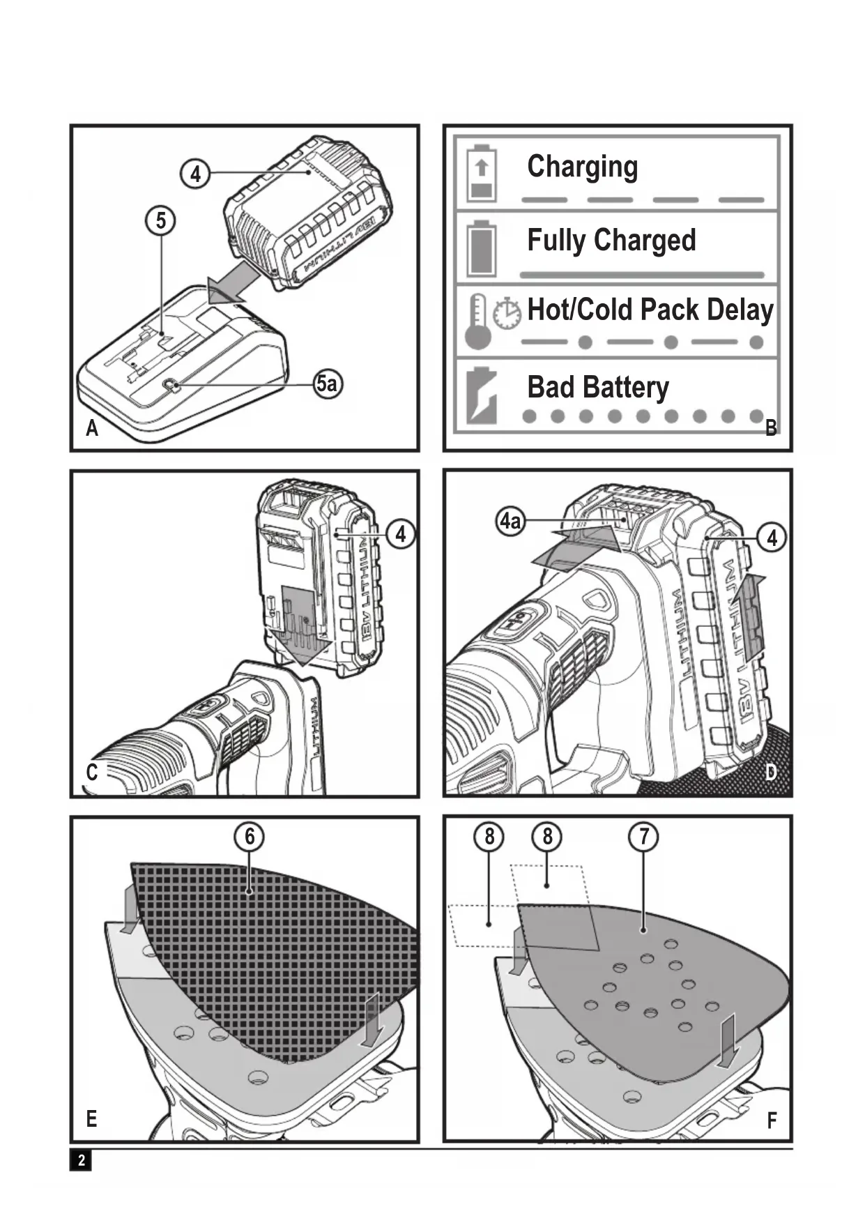 Accessories The accessories supplied with your sander depend upon the model that you have purchased. All the accessories listed below are available in our range. If you require an accessory that is listed below but is not supplied with your sander please visit our website at www.blackanddecker.eu. The performance of your tool depends on the accessory used. Stanley Fat Max accessories are engineered to high quality standards and designed to enhance the performance of your tool. By using these accessories you will get the very best from your tool. Item Description 240 grit sanding mesh. For a ne nish for large detail sanding. (Part Number - X39132-XJ) 120 grit sanding mesh. For a medium nish for large detail sanding. (Part Number - X39127-XJ) 80 grit sanding mesh. For a coarse nish for large detail sanding. (Part Number - X39122-XJ) 240 grit large detail sanding sheet with two replacement tips. For a ne nish for large detail sanding. (Part Number - X31019-XJ) 120 grit large detail sanding sheet with two replacement tips. For a medium nish for large detail sanding. (Part Number - X31009-XJ) 60 grit large detail sanding sheet with two replacement tips. For a coarse nish for large detail sanding. (Part Number - X31039-XJ) 120 grit detailed nger sanding sheet. For a medium nish for detailed sanding. (Part Number - X3277-XJ) Charging procedure (Fig. A) Stanley Fat Max chargers are designed to charge Stanley Fat Max battery packs. u Plug the charger (5) into an appropriate outlet before inserting the battery pack (4). u Insert the battery pack (4) into the charger (5) as shown in gure A. u The LED (5a) will ash indicating that the battery is being charged. u The completion of charge is indicated by the LED (5a) remaining on continuously. The pack is fully charged and may be used at this time or left on the charger. Note: Recharge discharged batteries as soon as possible after use or battery life may be greatly diminished. For longest battery life, do not discharge batteries fully.7 ENGLISH (Original instructions) It is recommended that the batteries be recharged after each use. Leaving the battery in the charger The charger (5) and battery pack (4) can be left connected with the LED glowing indenitely. The charger will keep the battery pack fresh and fully charged. Important charging notes u Longest life and best performance can be obtained if the battery pack is charged when the air temperature is between 65°F and 75°F (18°- 24°C). DO NOT charge the battery pack in an air temperature below +40°F (+4.5°C), or above +105°F (+40.5°C). This is important and will prevent serious damage to the battery pack. u The charger and battery pack may become warm to touch while charging. This is a normal condition, and does not indicate a problem. To facilitate the cooling of the battery pack after use, avoid placing the charger or battery pack in a warm environment such as in a metal shed, or an uninsulated trailer. u If the battery pack does not charge properly: u Check current at receptacle by plugging in a lamp or other appliance. u Check to see if receptacle is connected to a light switch which turns power off when you turn out the lights. u Move charger and battery pack to a location where the surrounding air temperature is approximately 65°F - 75°F (18°- 24°C). u If charging problems persist, take the tool, battery pack and charger to your local service center. u The battery pack should be recharged when it fails to produce sufcient power on jobs which were easily done previously. DO NOT CONTINUE to use under these conditions. Follow the charging procedure. You may also charge a partially used pack whenever you desire with no adverse affect on the battery pack. u Foreign materials of a conductive nature such as, but not limited to, steel wool, aluminium foil, or any buildup of metallic particles should be kept away from charger cavities. Always unplug the charger from the power supply when there is no battery pack in the cavity. Unplug charger before attempting to clean. u Do not freeze or immerse charger in water or any other liquid. Warning! Do not allow any liquid to get inside charger. Never attempt to open the battery pack for any reason. If the plastic housing of the battery pack breaks or cracks, return to a service center for recycling. Charger Diagnostics (Fig.B) Refer to the indicators in gure B for the charge status of the battery pack. Bad Battery If you see a bad battery blink pattern, do not continue to charge this battery. Return it to a service center or a collection site for recycling. Hot/Cold Pack Delay When the charger detects a battery pack that is too hot or too cold, it automatically starts a Hot/Cold Pack Delay, suspending charging until the battery pack has reached an appropriate temperature. The charger then automatically switches to the pack charging mode. This feature ensures maximum battery pack life. A cold battery pack will charge at a slower rate than a warm battery pack. The pack will charge at that slower rate throughout the entire charging cycle and will not return to maximum charge rate even if the pack warms. Installing and removing the battery pack from the tool To install battery pack (Fig. C) u Insert battery (4) into tool foot until an audible click is heard (Figure. C) u Ensure battery pack is fully seated and fully latched into position. To remove battery pack (Fig.D) u Depress the battery release button (4a) as shown in gure D and pull battery pack (4) out of tool foot. Assembly Warning! Before assembly, make sure that the tool is switched off and the battery is removed. Fitting sanding mesh (Fig. E) u Hold the tool with the sanding base facing upwards. u Place the sanding mesh (6) onto the sanding base, mak- ing sure that the holes in the sheet line up with the holes in the base. Fitting sanding sheets (Fig. F - Optional accessory) u Detach the two additional diamond-shaped tips (8) from the sanding sheet (7). The diamond-shaped tip (8) can be rev