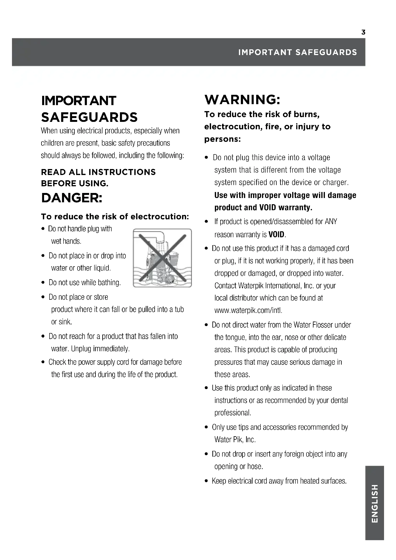 If product is opened/disassembled for ANY reason warranty is VOID. - Do not use this product if it has a damaged cord or plug, if it is not working properly, if it has been dropped or damaged, or dropped into water. Contact Waterpik International, Inc. or your local distributor which can be found at www.waterpik.com/intl.