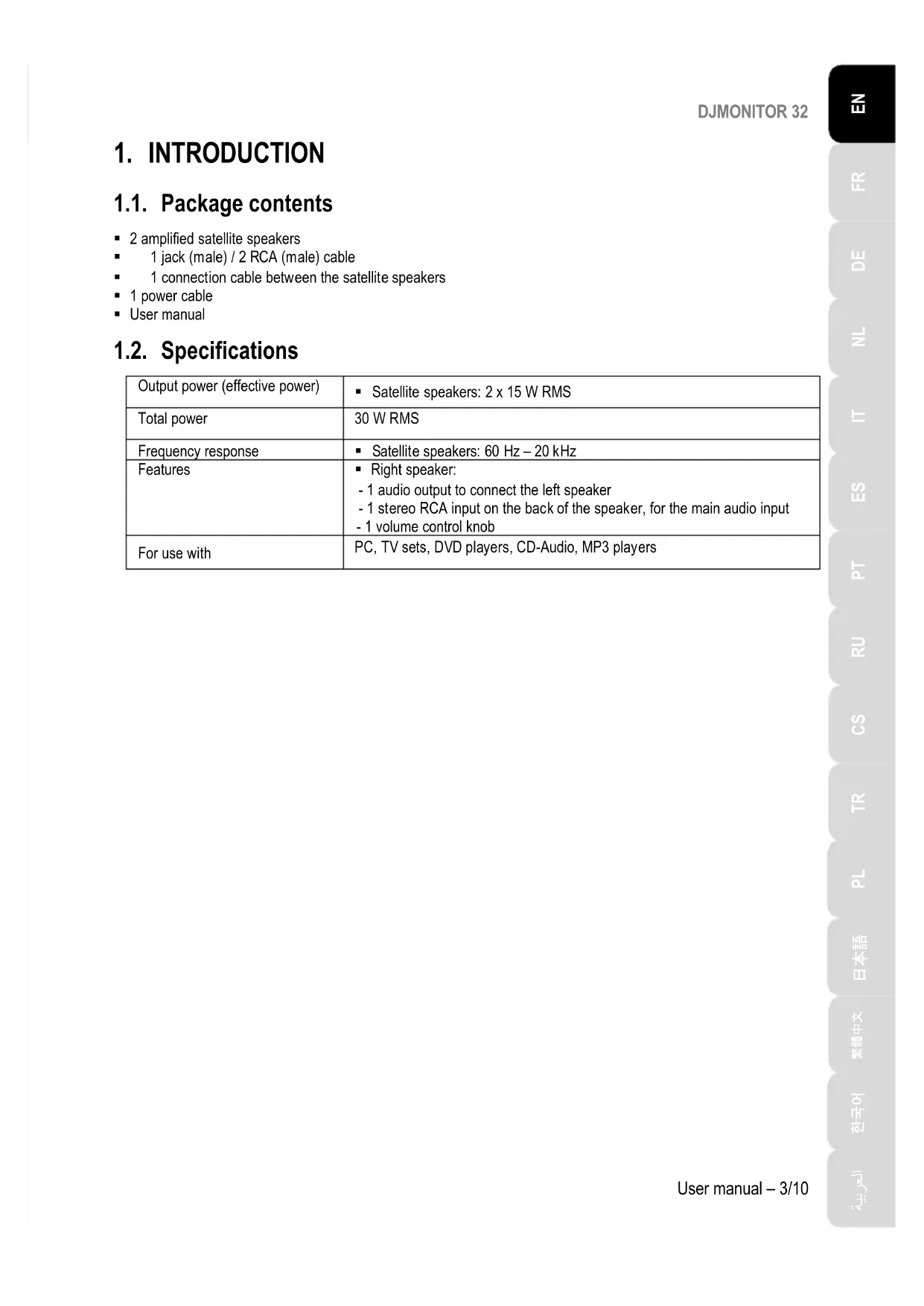 1.1. Package contents 2 amplified satellite speakers 1 jack (male) / 2 RCA (male) cable 1 connection cable between the satellite speakers 1 power cable User manual 1.2. Specifications Output power (effective power) Satellite speakers: 2 x 15 W RMS Total power 30 W RMS Frequency response Satellite speakers: 60 Hz – 20 kHz Features Right speaker: - 1 audio output to connect the left speaker - 1 stereo RCA input on the back of the speaker, for the main audio input - 1 volume control knob For use with PC, TV sets, DVD players, CD-Audio, MP3 playersDJMONITOR 32 4/10 – User manual 1.3. Recommendations - Place your satellite speakers on a flat surface to avoid the risk of the speakers falling. - Never open up your speaker kit, as you risk damaging its internal components. - This speaker kit is intended for use in a temperate environment. - To prevent the risk of fire or electrical discharge, keep your speaker kit away from: - rain or humidity, as well as all fluids (water, chemical products or any other liquids), - sources of heat such as heaters, stoves or any other heat-producing devices (including amplifiers), - direct sunlight. - Do not expose your speaker kit to drips or splashes of water. - Never place any object filled with liquid (a glass, vase...) on your speaker kit. - Unplug the power cable if you do not plan on using your speaker kit for an extended period of time. To disconnect the power cable, take hold of and pull on the plug; never pull on the cable itself. - Make sure that the speaker kit's power plug connected to an electrical outlet remains easily accessible. - Disconnect the speaker kit before cleaning. Use a damp cloth and avoid using aerosol cleaners. - The speaker kit's power plug serves to power off the device and must therefore be easily accessible at all times. - Markings are located on the back of the speakers.