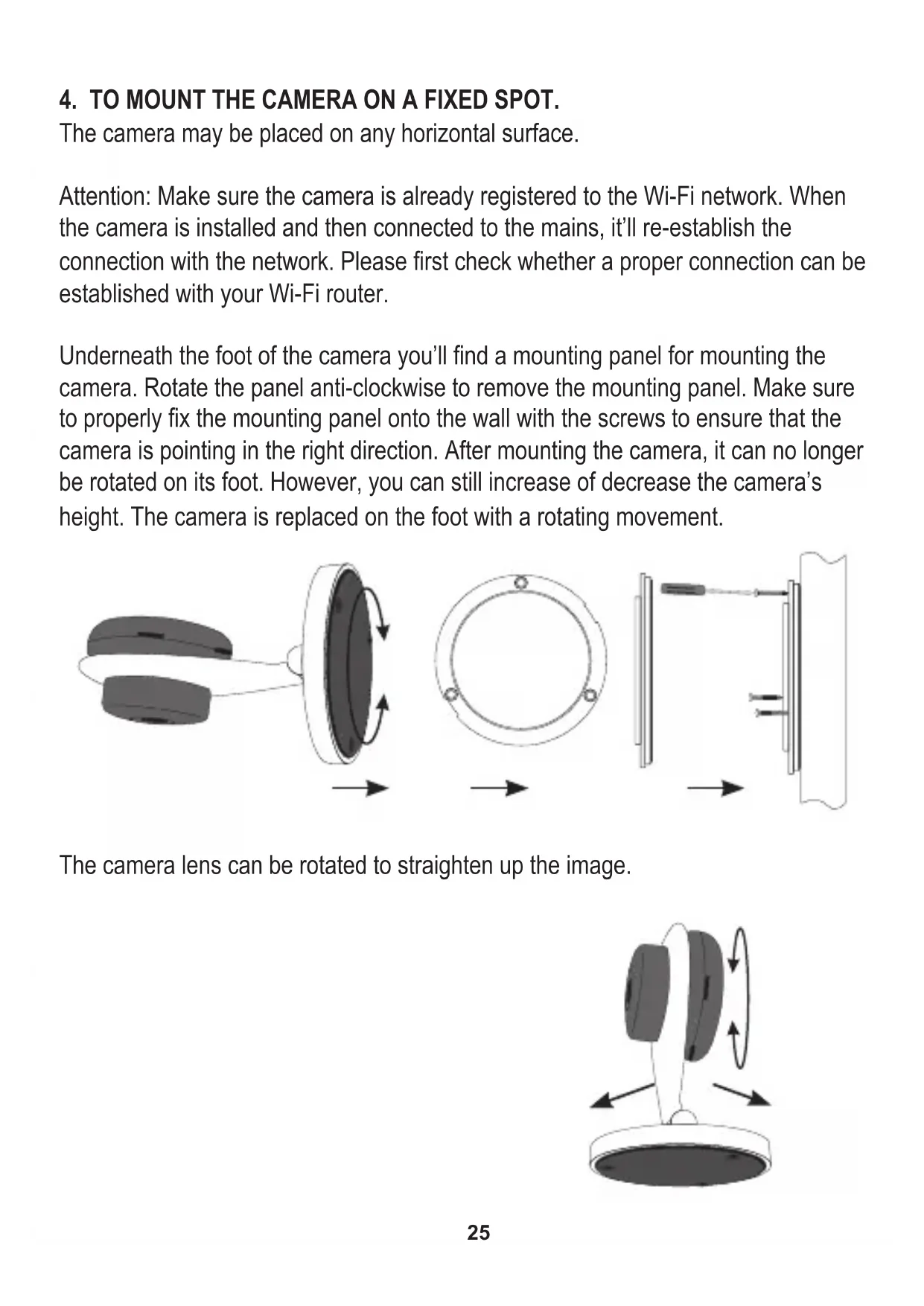 The camera may be placed on any horizontal surface. Attention: Make sure the camera is already registered to the Wi-Fi network. When the camera is installed and then connected to the mains, it’ll re-establish the connection with the network. Please rst check whether a proper connection can be established with your Wi-Fi router. Underneath the foot of the camera you’ll nd a mounting panel for mounting the camera. Rotate the panel anti-clockwise to remove the mounting panel. Make sure to properly x the mounting panel onto the wall with the screws to ensure that the camera is pointing in the right direction. After mounting the camera, it can no longer be rotated on its foot. However, you can still increase of decrease the camera’s height. The camera is replaced on the foot with a rotating movement. The camera lens can be rotated to straighten up the image.26 5 RESET. When contact with the camera is no longer possible and you can no longer determine what the IP address or the port number no longer corresponds, you can externally reset the camera to restore the default factory settings. At the rear of the camera you’ll nd a small hole marked ‘reset’. Use a pointy object such as a paperclip to press the button inside this hole. Press this button while the camera is starting up and keep it depressed for at least 10 seconds. The camera can now only be reached via Wi-Fi Direct. Now follow the registration process, see section 3. 6 TO INSERT THE SD CARD. At the side you’ll nd a slot for inserting a Micro SD card, this card slot sits rather deep. You might have to use a paperclip to carefully press the card until it clicks into the correct position. Reset Micro SD o SD Micro SDMicr