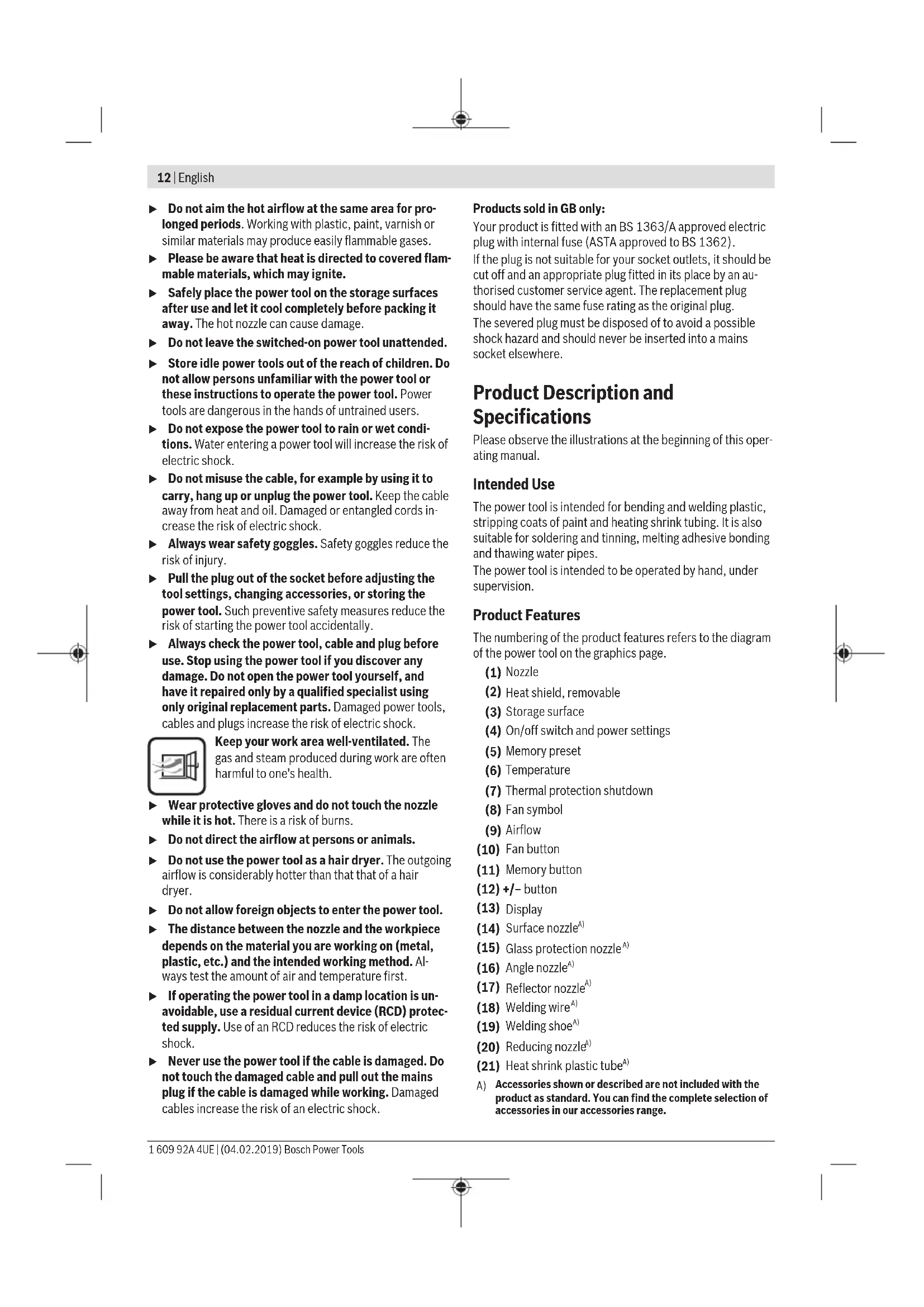 - Safely place the power tool on the storage surfaces after use and let it cool completely before packing it away. The hot nozzle can cause damage.