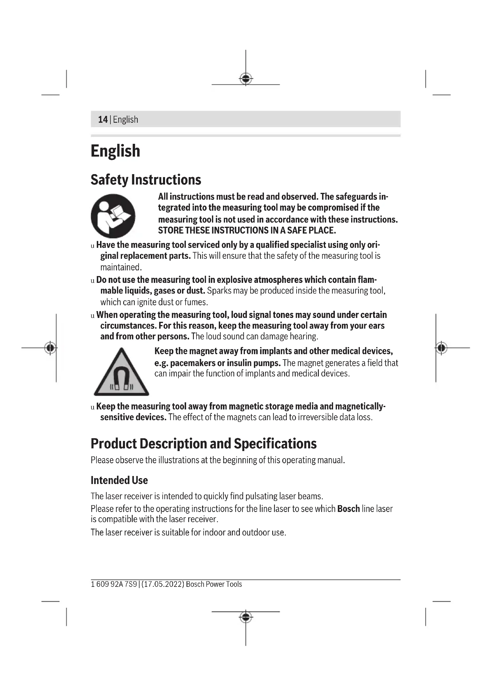 Batteries 2×1.5V LR3(AAA) Operating time, approx. 30h Weight according to EPTA-Procedure 01:2014 0.12kg Dimensions (length × width × height) 69×28×123mm Protection rating IP 54 (dust and splash-proof) A) The working range may be reduced by unfavourable environmental conditions (e.g. direct sun- light). B) X: Maximum working range for operation with laser receiver according to the operating instruc- tions for the Bosch line laser that is used C) Dependent on the distance between the laser receiver and the line laser D) Only non-conductive deposits occur, whereby occasional temporary conductivity caused by condensation is expected. For clear identification of your laser receiver, see the serial number (13) on the type plate. Noise Information Typically the A-weighted sound pressure level of the audio signal is 80dB(A) at 1m away. Do not hold the laser receiver close to your ear. Assembly Inserting/Changing the Batteries Alkali-manganese batteries are recommended for the laser receiver. 1 609 92A 7S9 | (17.05.2022) Bosch Power ToolsEnglish | 17 Pull the locking mechanism (15) of the battery compartment cover outwards and fold open the battery compartment cover (14). Insert the batteries. When doing so, ensure that the polarity is correct and corresponds to the diagram on the battery compartment cover. When the batteries are weak, the status indicator(3) will begin to flash. It is still possible to work for about two hours with the laser receiver. Always replace all the batteries at the same time. Only use batteries from the same man- ufacturer and which have the same capacity. u Take the batteries out of the laser receiver when you are not using it for a pro- longed period of time. The batteries can corrode and self-discharge during pro- longed storage in the laser receiver. Operation Starting operation u Protect the laser receiver against moisture and direct sunlight. u Do not subject the laser receiver to extreme temperatures or variations in tem- perature. As an example, do not leave it in vehicles for longer periods. In case of large variations in temperature, allow the laser receiver to adjust to the ambient temperat- ure before putting it into operation. In case of extreme temperatures or variations in temperature, the accuracy of the laser receiver can be impaired. Setting up the Laser Receiver (seefigureA) Place the laser receiver at least 5m away from the line laser. Ensure that receiver mode is active on the line laser. Select an operating mode in which either only a horizontal or only a vertical laser plane is generated. Note: Do not select an operating mode which generates both horizontal and vertical laser planes at the same time (cross-line operation) because this might impair the height readings of the laser beam. Position the laser receiver so that the laser beam can reach the reception area(9). Align it so that the laser beam runs straight through the reception area (as shown in the fig- ure). Switching On/Off u A loud audio signal sounds when switching on the laser receiver. Therefore, keep the laser receiver away from your ear or other persons when switching it on. The loud sound can damage hearing. Bosch Power Tools 1 609 92A 7S9 | (17.05.2022)18 | English To switch on the laser receiver, press the on/off button(2). All LEDs light up briefly and an audio signal sounds. After the laser receiver is switched on, the volume is always set to low and the reception accuracy set to "fine". To switch off the laser receiver, press the on/off button(2) again. Before switching off, all LEDs light up briefly and three audio signals sound. The status indicator(3) goes out. If no button on the laser receiver is pressed for approx. 20min and no laser beam reaches the reception area(9) for 20min, then the laser receiver will automatically switch itself off to preserve battery life. Selecting the setting of the centre line indicator You can use the button for adjusting the reception accuracy(1) to specify the accuracy with which the position of the laser beam is indicated as "centred" on the reception area: – Reception accuracy "fine" (the centre line LED(7) flashes), – Reception accuracy "coarse" (the LED direction indicators "Laser beam over centre line"(6) and "Laser beam under centre line"(8) flash). Direction Indicators The position of the laser beam in the reception area(9) is indicated as follows: – By the direction LEDs "Laser beam above centre line"(6), "Laser beam below centre line"(8) or centre line indicator(7) on the front and back of the laser receiver, – optionally by the audio signal. Laser receiver too low: If the laser beam hits the upper half of the reception area(9), then the "Laser beam above centre line" LED direction indicators(6) light up. If the audio signal is switched on, a signal sounds at a high frequency. Move the laser receiver upwards in the direction of the arrow. Laser receiver too high: If the laser beam hits the lower half of the reception area(9), then the "Laser beam below centre line" LED direction indicators(8) light up. If the audio signal is switched on, a signal sounds at a low frequency. Move the laser receiver downwards in the arrow direction. Laser receiver centred: If the laser beam hits the reception area(9) at the height of the centre mark(12), then the centre line LEDs(7) light up. If the audio signal is switched on, a continuous tone sounds. Laser Beam Indicator Audio Signal The position of the laser beam on the reception area (9) can also be indicated by an au- dio signal. The volume level can be changed or the audio signal switched off. 1 609 92A 7S9 | (17.05.2022) Bosch Power ToolsEnglish | 19 To change or switch off the audio signal, press the audio signal button(4). When the volume is low, a brief audio signal will sound and the centre line indicator LED(7) will light up. When the volume is high, a brief audio signal will sound and the LED direction indicators(6), (7) and (8) will light up. When the audio signal is switc