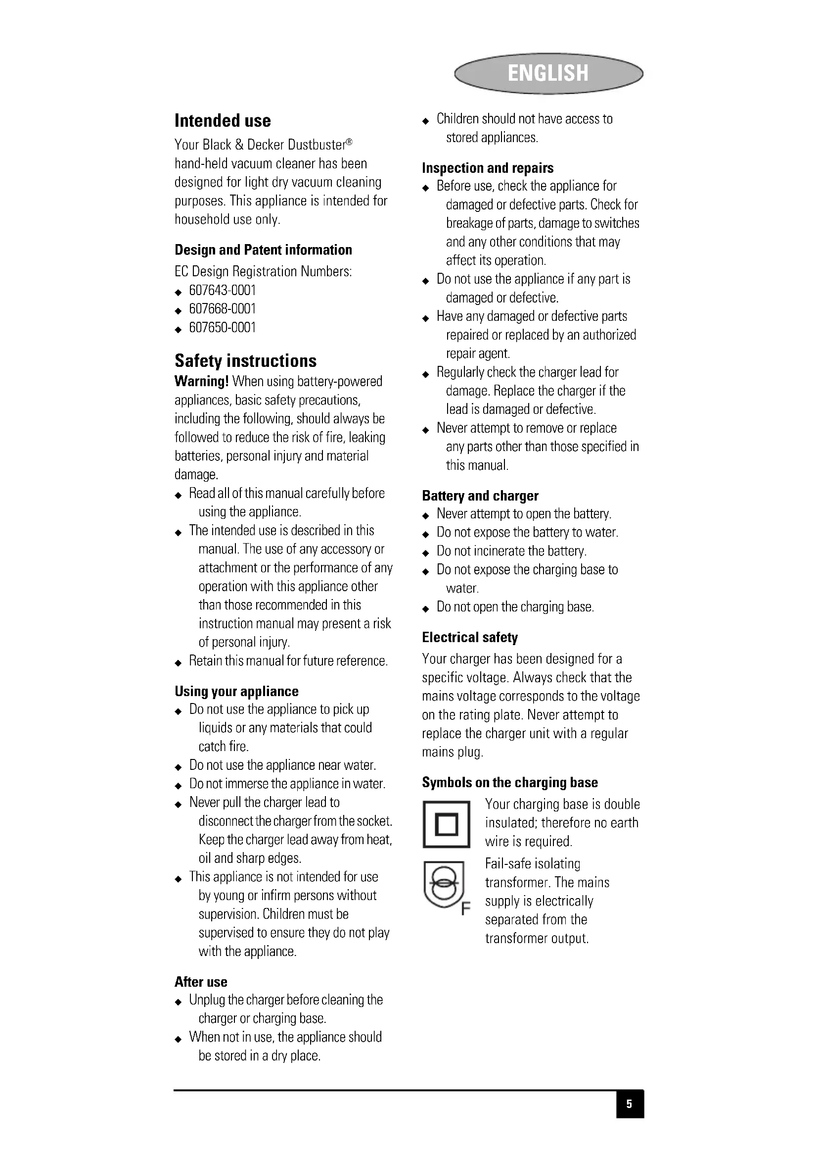 hand-held vacuum cleaner has been designed for light dry vacuum cleaning purposes. This appliance is intended for household use only. Design and Patent information EC Design Registration Numbers: X 607643-0001X 607668-0001X 607650-0001 Safety instructions Warning! When using battery-powered appliances, basic safety precautions, including the following, should always be followed to reduce the risk of fire, leaking batteries, personal injury and material damage. X Read all of this manual carefully before using the appliance. X The intended use is described in this manual. The use of any accessory or attachment or the performance of any operation with this appliance other than those recommended in this instruction manual may present a risk of personal injury. X Retain this manual for future reference. Using your appliance X Do not use the appliance to pick up liquids or any materials that could catch fire. X Do not use the appliance near water. X Do not immerse the appliance in water.X Never pull the charger lead to disconnect the charger from the socket. Keep the charger lead away from heat, oil and sharp edges. X This appliance is not intended for use by young or infirm persons without supervision. Children must be supervised to ensure they do not play with the appliance. After use X Unplug the charger before cleaning the charger or charging base. X When not in use, the appliance should be stored in a dry place. X Children should not have access to stored appliances. Inspection and repairs X Before use, check the appliance for damaged or defective parts. Check for breakage of parts, damage to switches and any other conditions that may affect its operation. X Do not use the appliance if any part is damaged or defective. X Have any damaged or defective parts repaired or replaced by an authorized repair agent. X Regularly check the charger lead for damage. Replace the charger if the lead is damaged or defective. X Never attempt to remove or replace any parts other than those specified in this manual. Battery and charger X Never attempt to open the battery. X Do not expose the battery to water. X Do not incinerate the battery. X Do not expose the charging base to water. X Do not open the charging base. Electrical safety Your charger has been designed for a specific voltage. Always check that the mains voltage corresponds to the voltage on the rating plate. Never attempt to replace the charger unit with a regular mains plug. Symbols on the charging base Your charging base is double insulated; therefore no earth wire is required. Fail-safe isolating transformer. The mains supply is electrically separated from the transformer output.6 ENGLISH The charger automatically shuts off if the ambient temperature becomes too high. As a consequence the charger will be inoperable. The charging base must be disconnected from the mains supply and taken to an authorised service centre for repair. The charging base is intended for indoor use only. Features