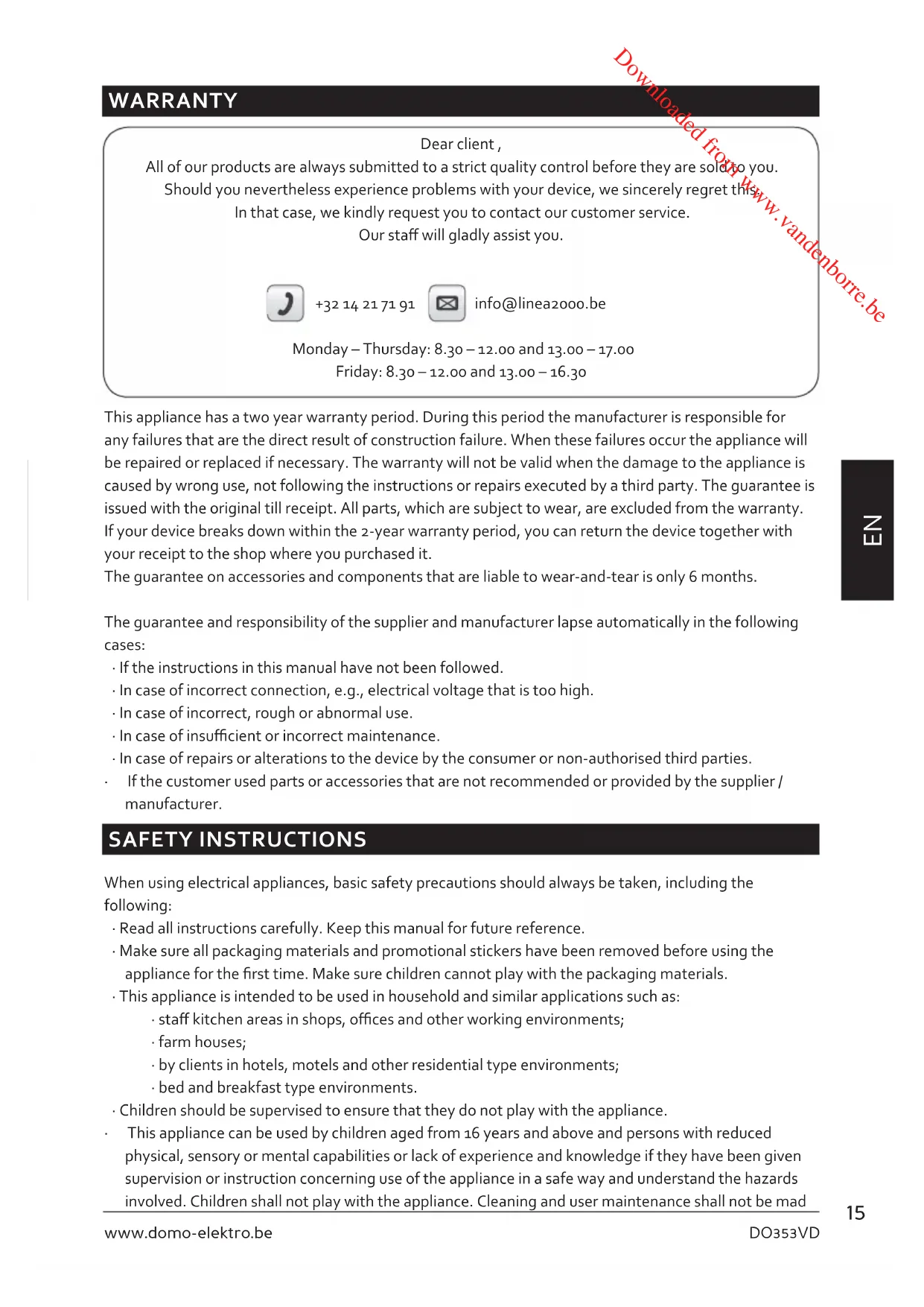 WARRANTY Dear client , All of our products are always submitted to a strict quality control before they are sold to you. Should you nevertheless experience problems with your device, we sincerely regret this. In that case, we kindly request you to contact our customer service. Our sta will gladly assist you. +32 14 21 71 91 info@linea2000.be Monday – Thursday: 8.30 – 12.00 and 13.00 – 17.00 Friday: 8.30 – 12.00 and 13.00 – 16.30 This appliance has a two year warranty period. During this period the manufacturer is responsible for any failures that are the direct result of construction failure. When these failures occur the appliance will be repaired or replaced if necessary. The warranty will not be valid when the damage to the appliance is caused by wrong use, not following the instructions or repairs executed by a third party. The guarantee is issued with the original till receipt. All parts, which are subject to wear, are excluded from the warranty. If your device breaks down within the 2-year warranty period, you can return the device together with your receipt to the shop where you purchased it. The guarantee on accessories and components that are liable to wear-and-tear is only 6 months. The guarantee and responsibility of the supplier and manufacturer lapse automatically in the following cases:
