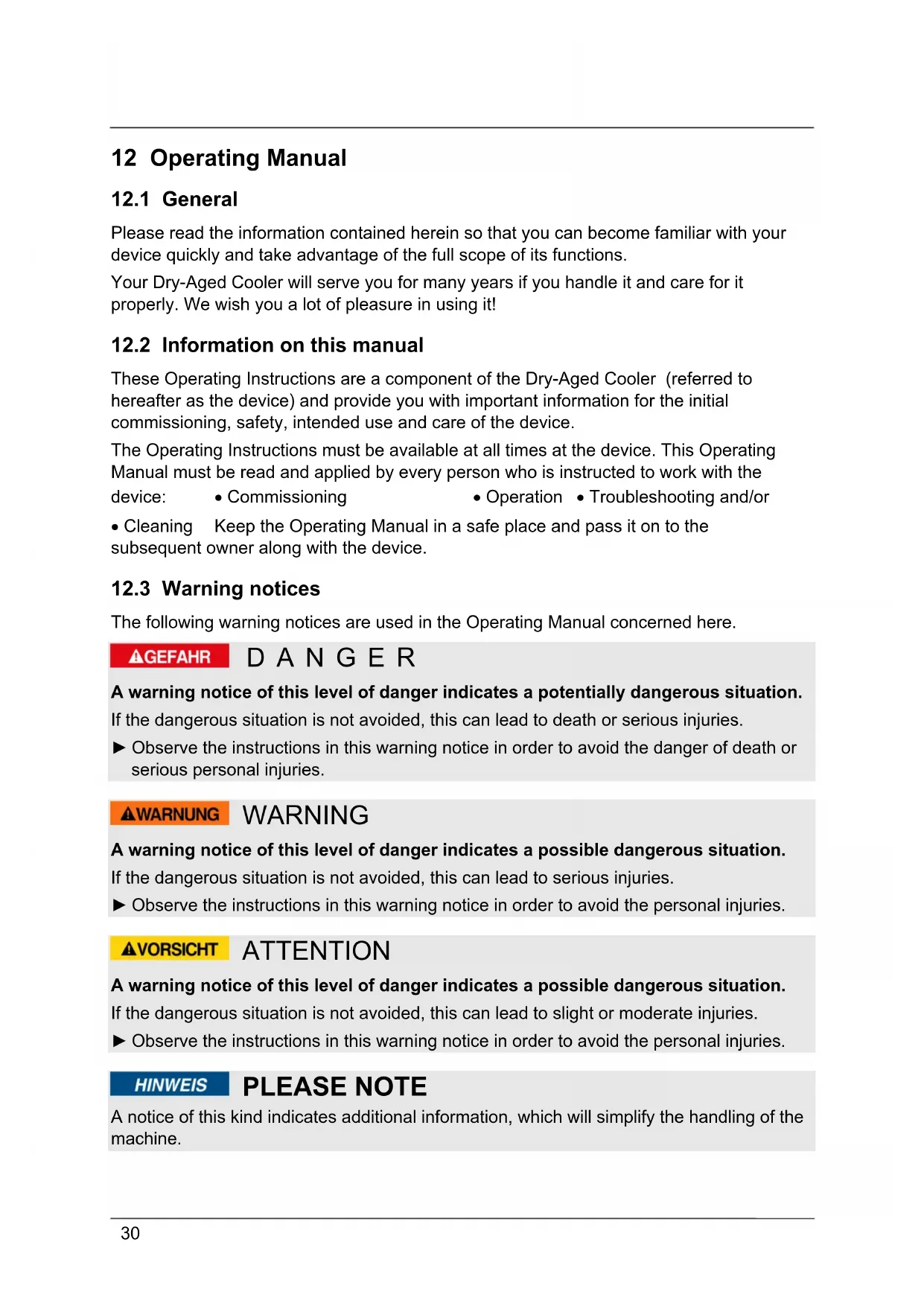 These Operating Instructions are a component of the Dry-Aged Cooler (referred to hereafter as the device) and provide you with important information for the initial commissioning, safety, intended use and care of the device. The Operating Instructions must be available at all times at the device. This Operating Manual must be read and applied by every person who is instructed to work with the device: Commissioning Operation Troubleshooting and/or Cleaning Keep the Operating Manual in a safe place and pass it on to the subsequent owner along with the device.