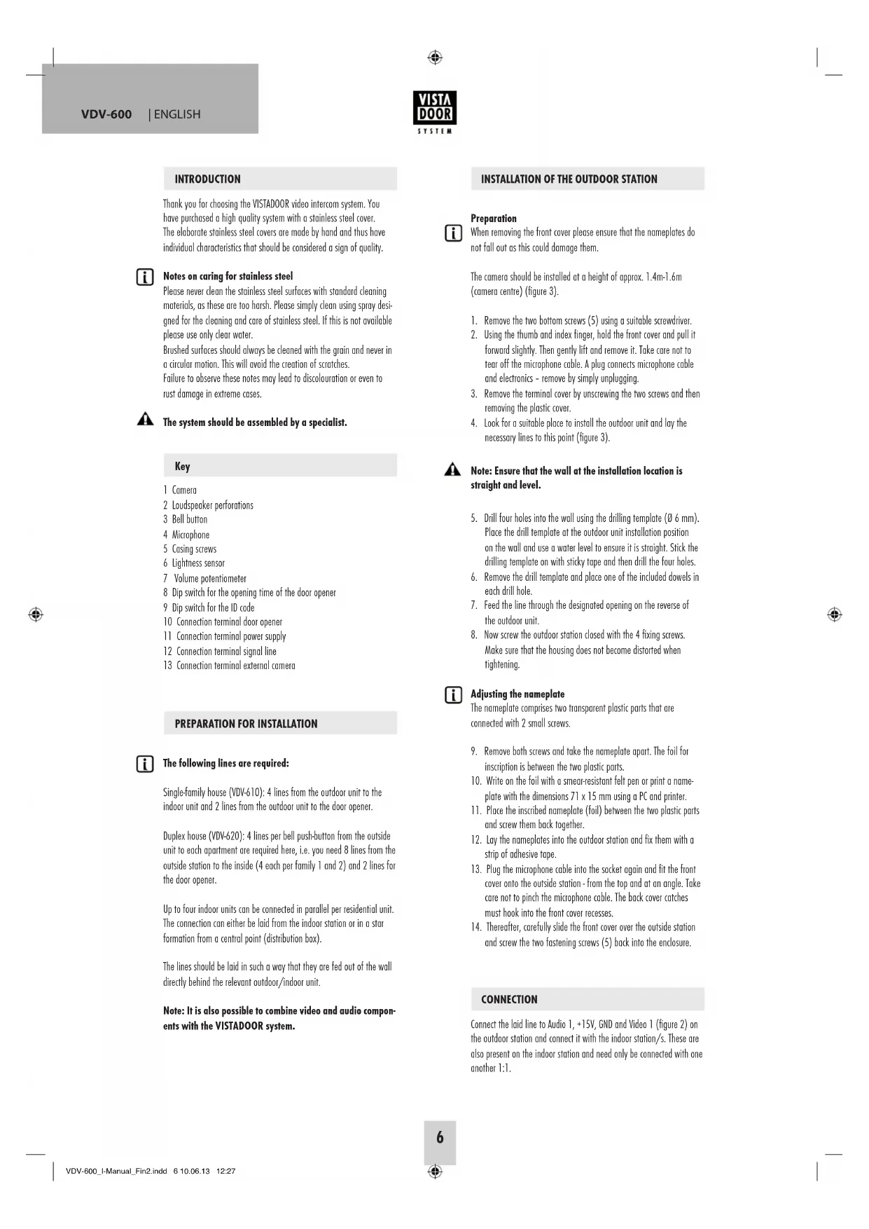 Thank you for choosing the VISTADOOR video intercom system. You have purchased a high quality system with a stainless steel cover. The elaborate stainless steel covers are made by hand and thus have individual characteristics that should be considered a sign of quality.
