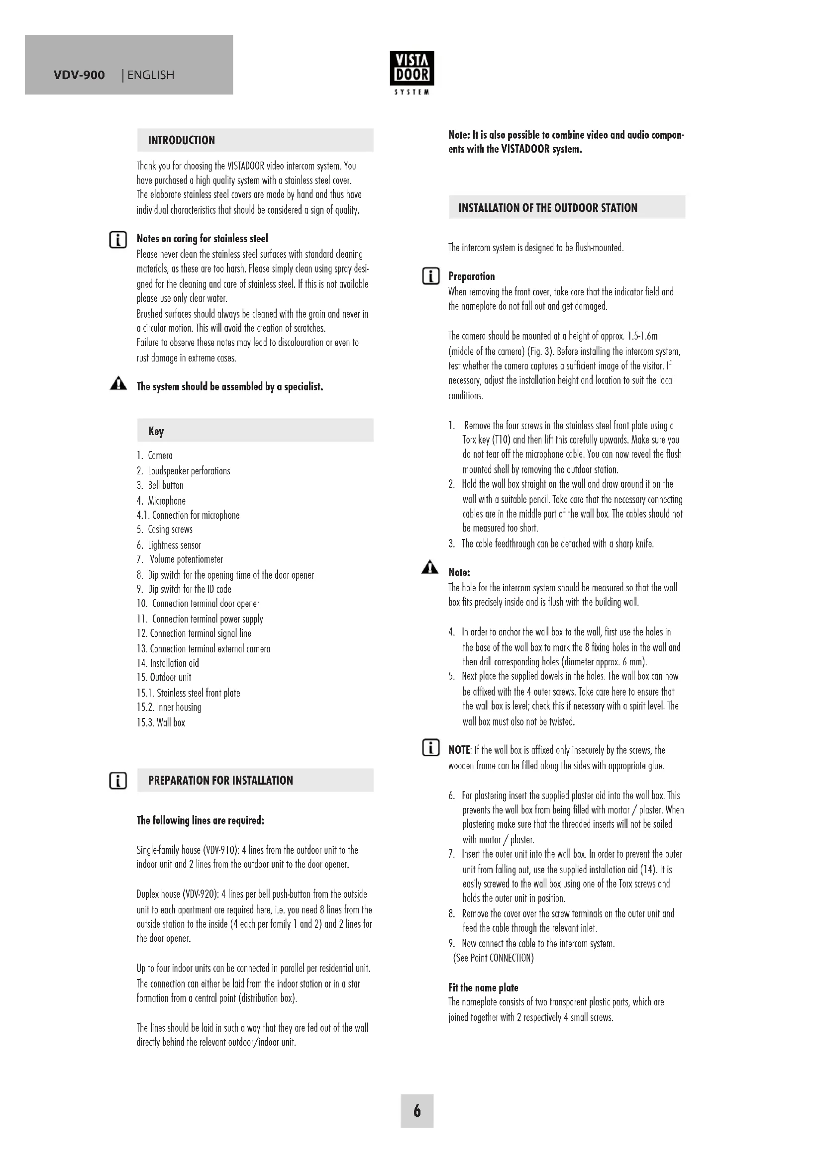 Thank you for choosing the VISTADOOR video intercom system. You have purchased a high quality system with a stainless steel cover. The elaborate stainless steel covers are made by hand and thus have individual characteristics that should be considered a sign of quality.