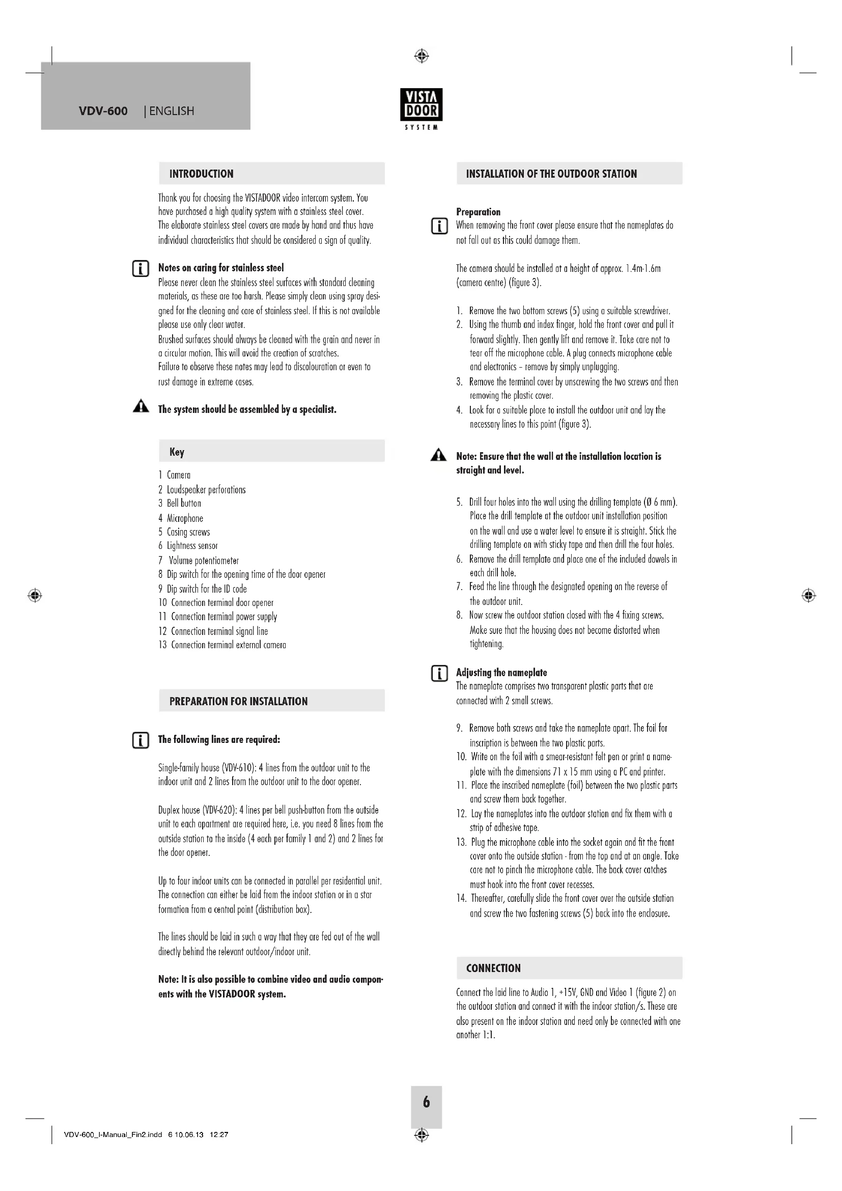 Thank you for choosing the VISTADOOR video intercom system. You have purchased a high quality system with a stainless steel cover. The elaborate stainless steel covers are made by hand and thus have individual characteristics that should be considered a sign of quality.