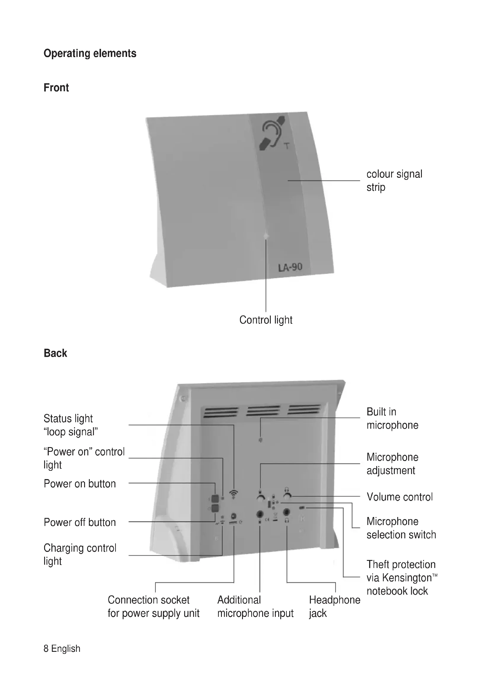 The induction loop system is already completely installed and set up in the housing. All you have to do is to place the LA-90 at the desired position between you and the person you are talking to and connect the power supply unit. Please note that the microphone on the back of the device should be facing the speaker.
