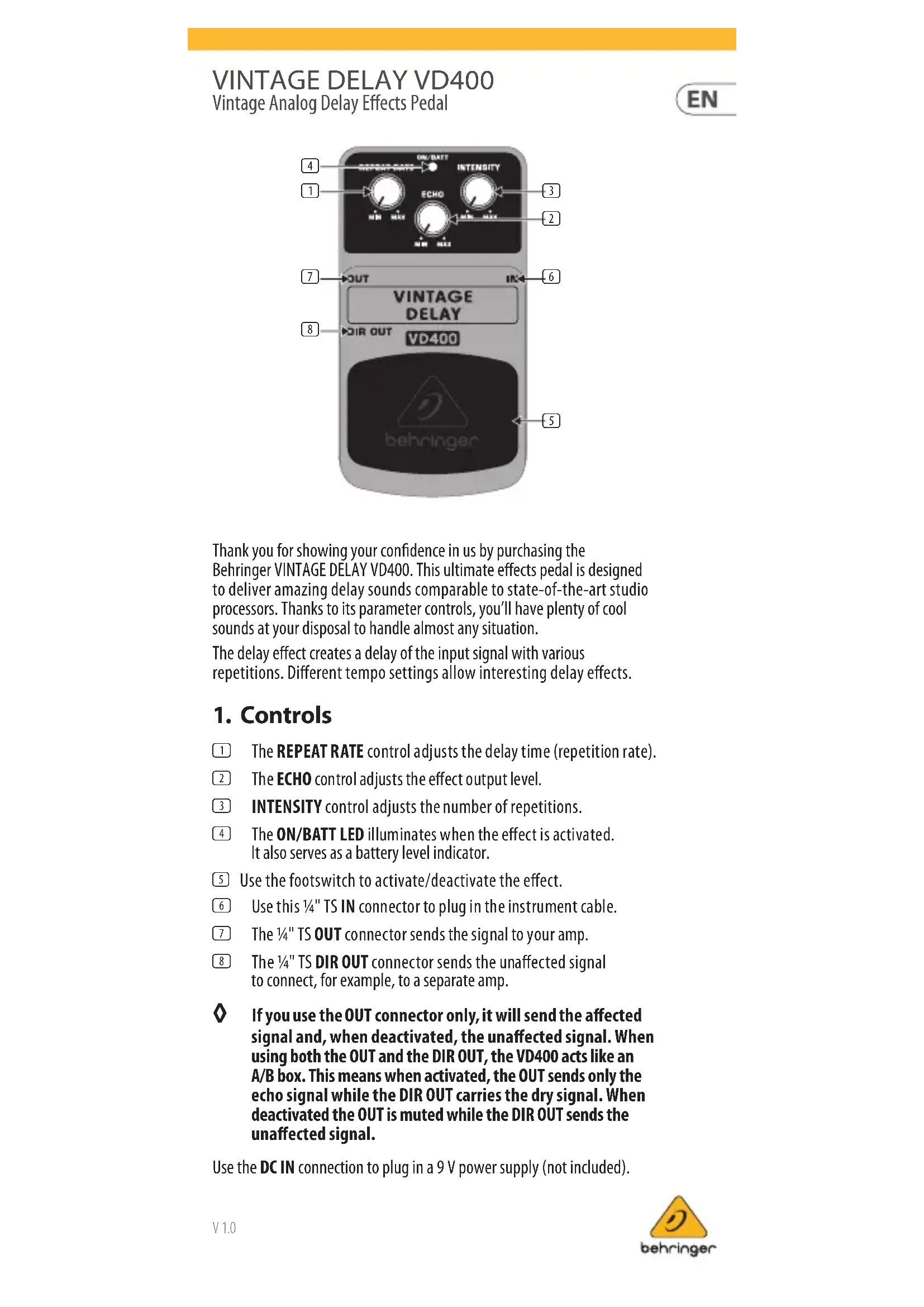 Vintage Analog Delay Eects Pedal Thank you for showing your condence in us by purchasing the Behringer VINTAGE DELAY VD400. This ultimate eects pedal is designed to deliver amazing delay sounds comparable to state-of-the-art studio processors. Thanks to its parameter controls, you’ll have plenty of cool sounds at your disposal to handle almost any situation.The delay eect creates a delay of the input signal with various repetitions. Dierent tempo settings allow interesting delay eects.