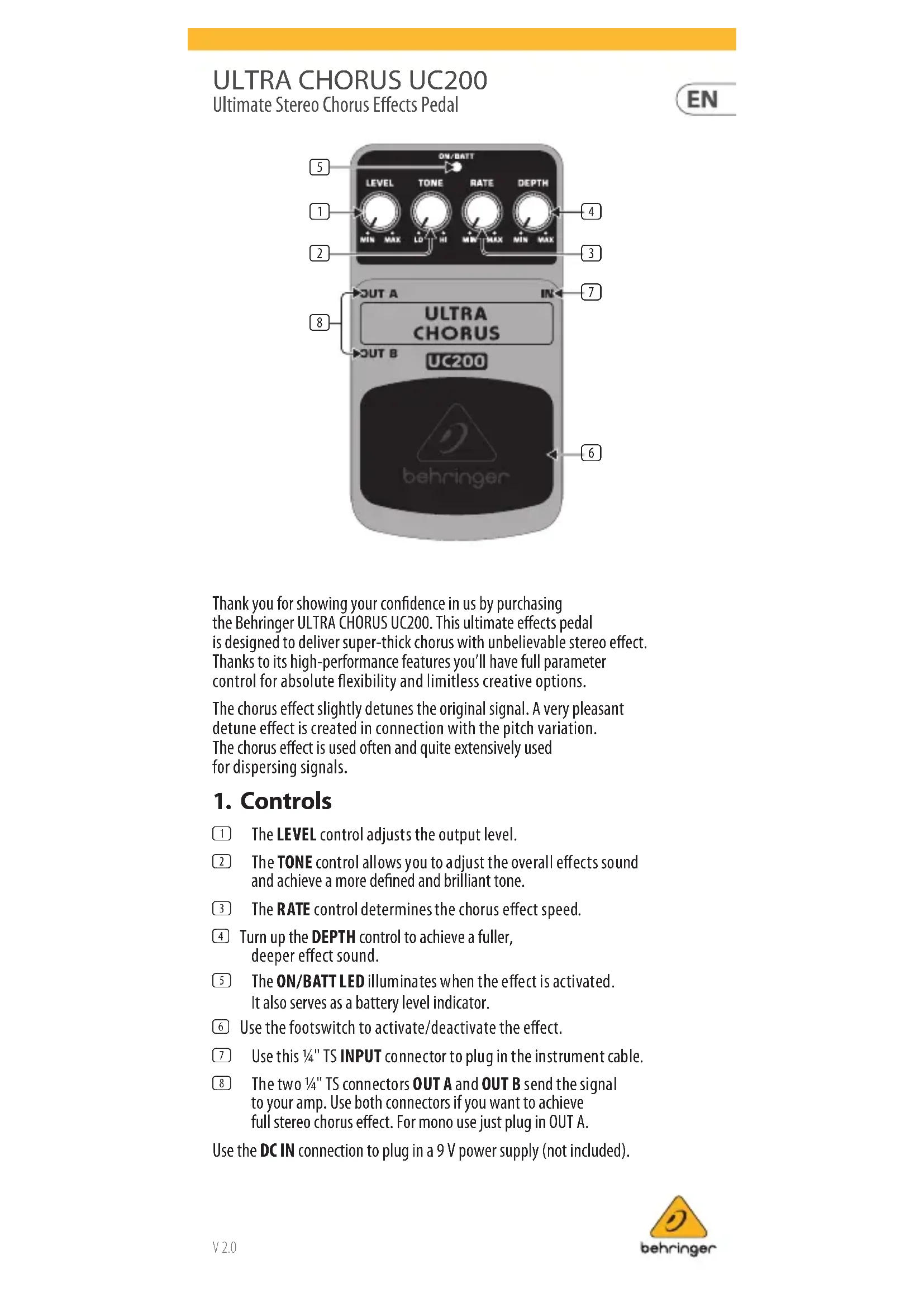 (1) The LEVEL control adjusts the output level. (2) The TONE control allows you to adjust the overall eects sound and achieve a more dened and brilliant tone. (3) The RATE control determines the chorus eect speed. (4) Turn up the DEPTH control to achieve a fuller, deeper eect sound. (5) The ON/BATT LED illuminates when the eect is activated. It also serves as a battery level indicator. (6) Use the footswitch to activate/deactivate the eect. (7) Use this ¼" TS INPUT connector to plug in the instrument cable. (8) The two ¼" TS connectors OUT A and OUT B send the signal to your amp. Use both connectors if you want to achieve full stereo chorus eect. For mono use just plug in OUT A. Use the DC IN connection to plug in a 9 V power supply (not included). V 2.0