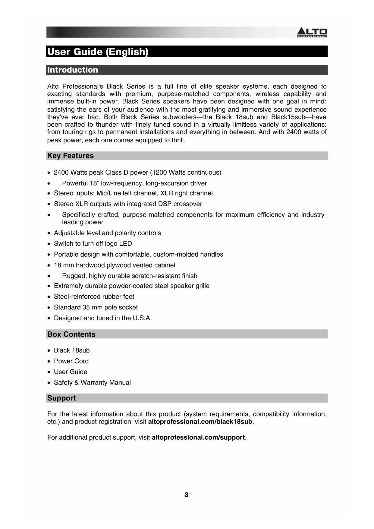 - Safety & Warranty Manual Support For the latest information about this product (system requirements, compatibility information, etc.) and product registration, visit altoprofessional.com/black18sub. For additional product support, visit altoprofessional.com/support.4
