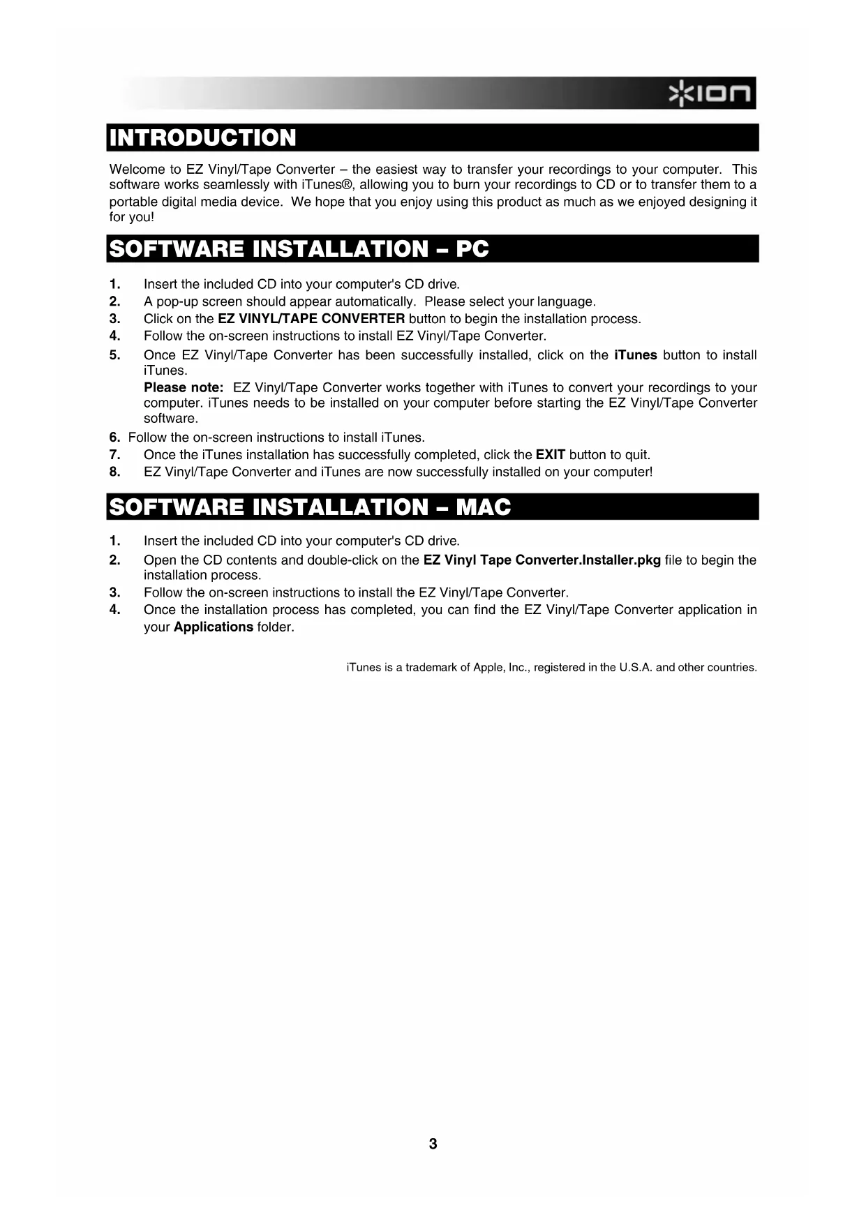 INTRODUCTION Welcome to EZ Vinyl/Tape Converter – the easiest way to transfer your recordings to your computer. This software works seamlessly with iTunes®, allowing you to burn your recordings to CD or to transfer them to a portable digital media device. We hope that you enjoy using this product as much as we enjoyed designing it for you!