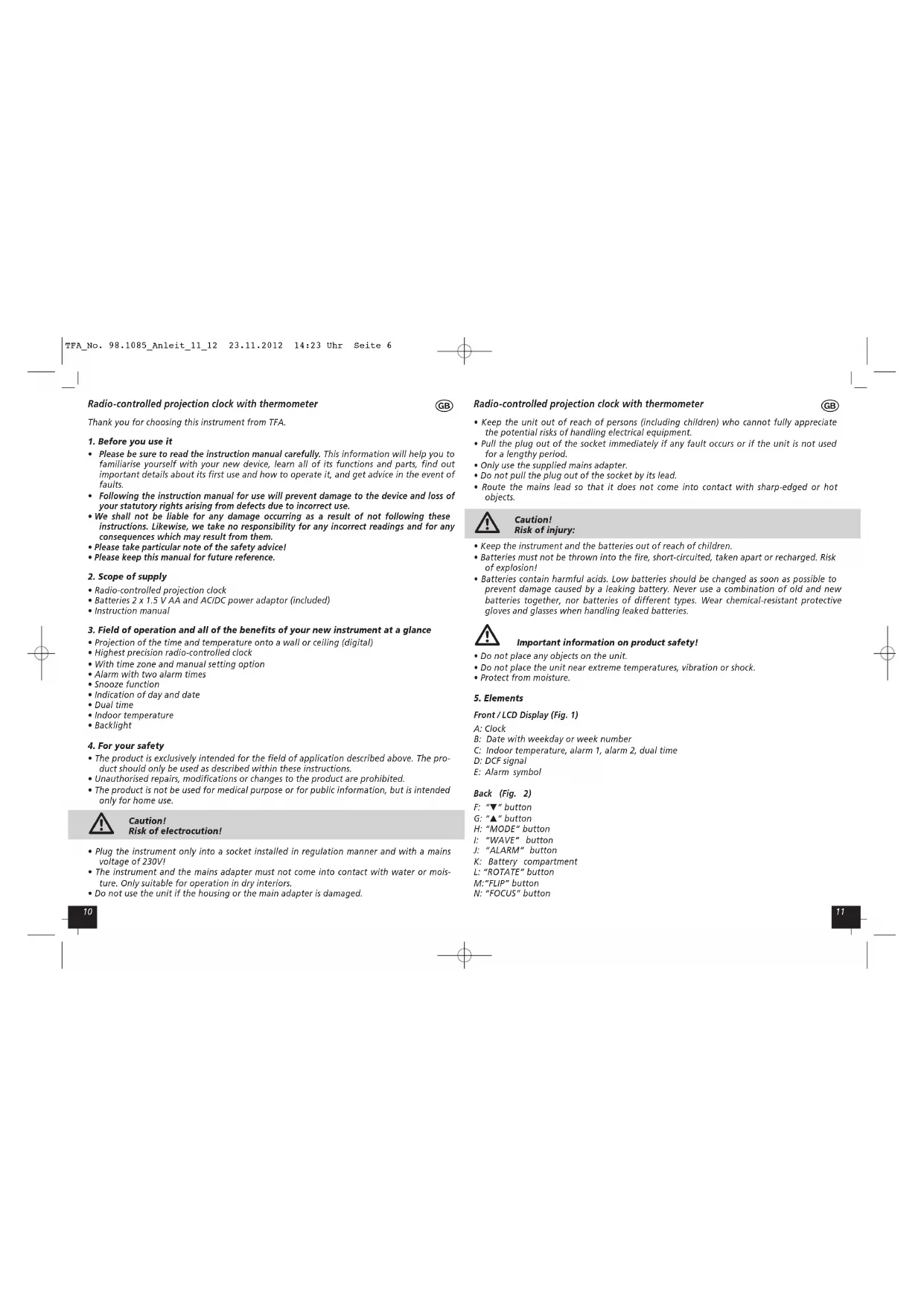 Download the instructions for your Alarm bell in PDF format for free! Find your manual 98.1085 - TFA and take your electronic device back in hand. On this page are published all the documents necessary for the use of your device. 98.1085 by TFA.