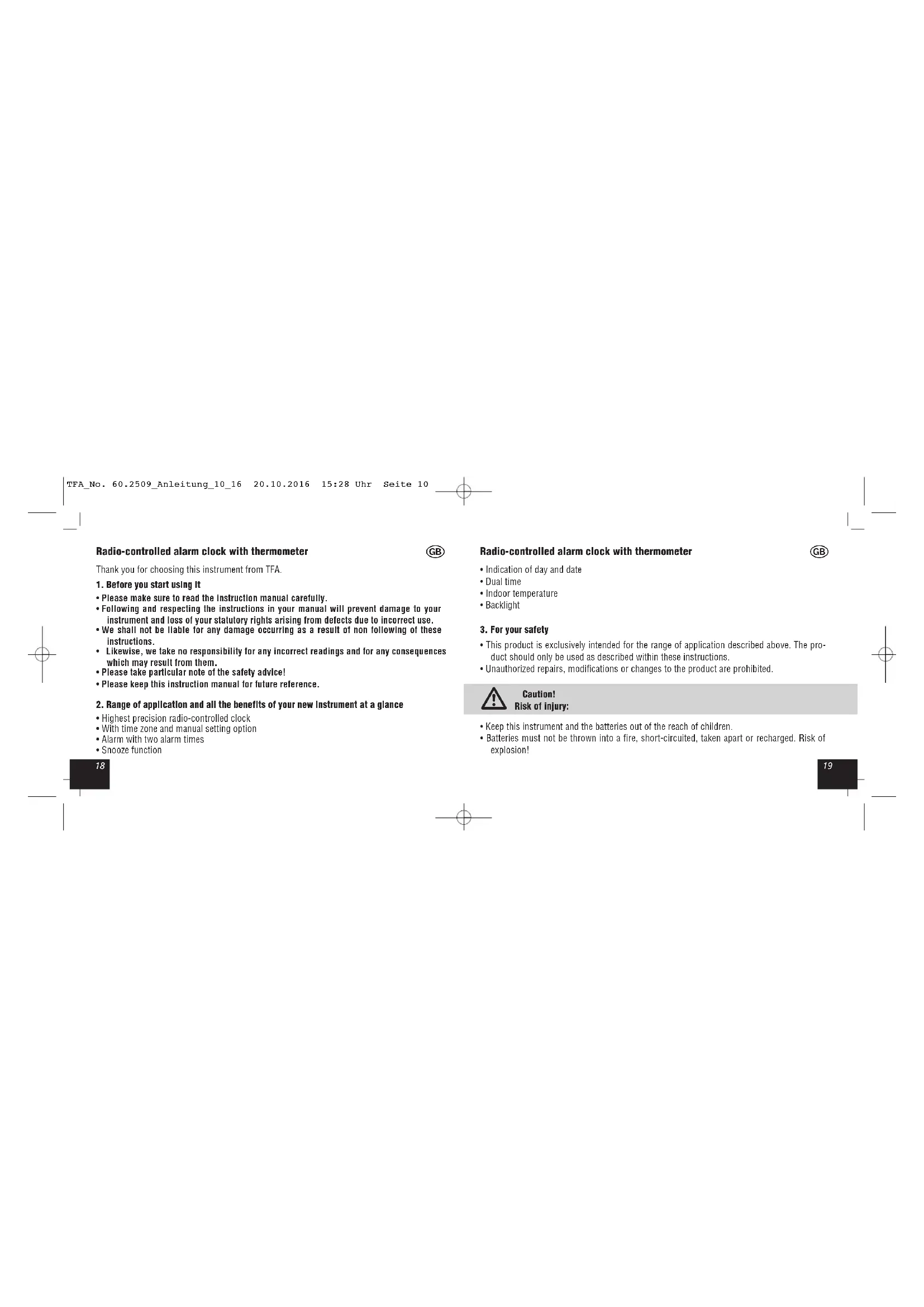 Download the instructions for your Alarm bell in PDF format for free! Find your manual 60.2509 - TFA and take your electronic device back in hand. On this page are published all the documents necessary for the use of your device. 60.2509 by TFA.