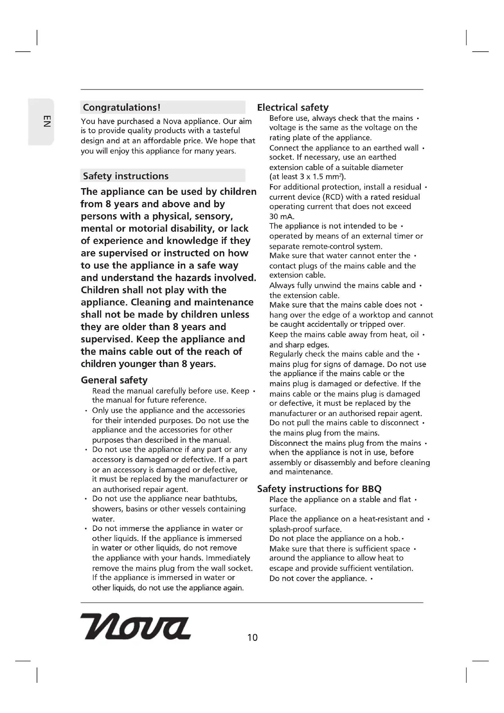 For additional protection, install a residual • current device (RCD) with a rated residual operating current that does not exceed 30 mA. The appliance is not intended to be • operated by means of an external timer or separate remote-control system. Make sure that water cannot enter the • contact plugs of the mains cable and the extension cable. Always fully unwind the mains cable and • the extension cable. Make sure that the mains cable does not • hang over the edge of a worktop and cannot be caught accidentally or tripped over. Keep the mains cable away from heat, oil • and sharp edges. Regularly check the mains cable and the • mains plug for signs of damage. Do not use the appliance if the mains cable or the mains plug is damaged or defective. If the mains cable or the mains plug is damaged or defective, it must be replaced by the manufacturer or an authorised repair agent. Do not pull the mains cable to disconnect • the mains plug from the mains. Disconnect the mains plug from the mains • when the appliance is not in use, before assembly or disassembly and before cleaning and maintenance. Safety instructions for BBQ Place the appliance on a stable and flat • surface. Place the appliance on a heat-resistant and • splash-proof surface. Do not place the appliance on a hob.• Make sure that there is sufficient space • around the appliance to allow heat to escape and provide sufficient ventilation. Do not cover the appliance. • Congratulations! You have purchased a Nova appliance. Our aim is to provide quality products with a tasteful design and at an affordable price. We hope that you will enjoy this appliance for many years. Safety instructions The appliance can be used by children from 8 years and above and by persons with a physical, sensory, mental or motorial disability, or lack of experience and knowledge if they are supervised or instructed on how to use the appliance in a safe way and understand the hazards involved. Children shall not play with the appliance. Cleaning and maintenance shall not be made by children unless they are older than 8 years and supervised. Keep the appliance and the mains cable out of the reach of children younger than 8 years. General safety Read the manual carefully before use. Keep • the manual for future reference. Only use the appliance and the accessories • for their intended purposes. Do not use the appliance and the accessories for other purposes than described in the manual. Do not use the appliance if any part or any • accessory is damaged or defective. If a part or an accessory is damaged or defective, it must be replaced by the manufacturer or an authorised repair agent. Do not use the appliance near bathtubs, • showers, basins or other vessels containing water. Do not immerse the appliance in water or • other liquids. If the appliance is immersed in water or other liquids, do not remove the appliance with your hands. Immediately remove the mains plug from the wall socket. If the appliance is immersed in water or other liquids, do not use the appliance again.11