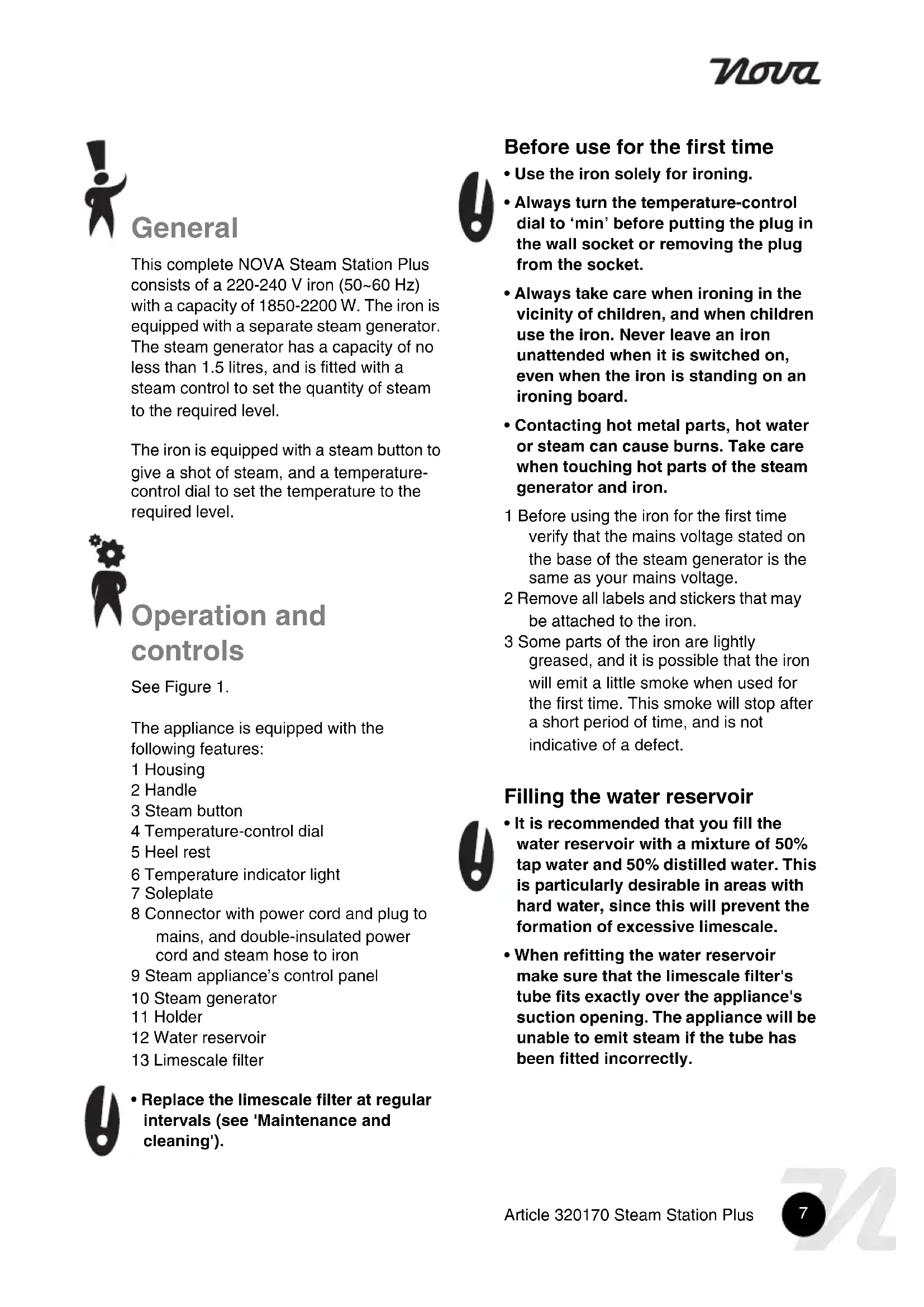 - 2002/96/EG7 Article 320170 Steam Station Plus General This complete NOVA Steam Station Plus consists of a 220-240 V iron (50~60 Hz) with a capacity of 1850-2200 W. The iron is equipped with a separate steam generator. The steam generator has a capacity of no less than 1.5 litres, and is fitted with a steam control to set the quantity of steam to the required level. The iron is equipped with a steam button to give a shot of steam, and a temperature- control dial to set the temperature to the required level. Operation and controls See Figure 1. The appliance is equipped with the following features: 1 Housing 2 Handle 3 Steam button 4 Temperature-control dial 5 Heel rest 6 Temperature indicator light 7 Soleplate 8 Connector with power cord and plug to mains, and double-insulated power cord and steam hose to iron 9 Steam appliance’s control panel 10 Steam generator 11 Holder 12 Water reservoir 13 Limescale filter
