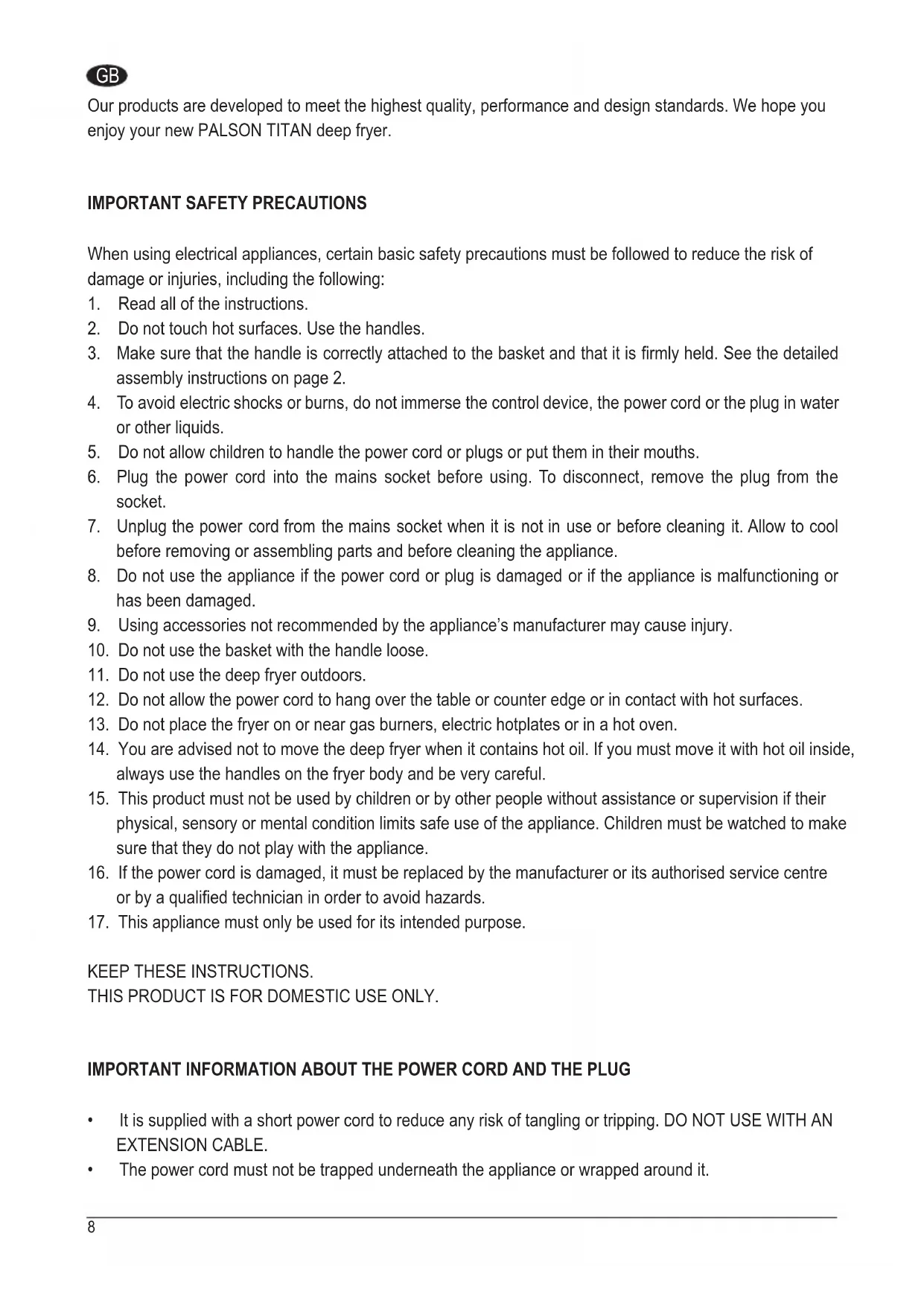 Our products are developed to meet the highest quality, performance and design standards. We hope you enjoy your new PALSON TITAN deep fryer.