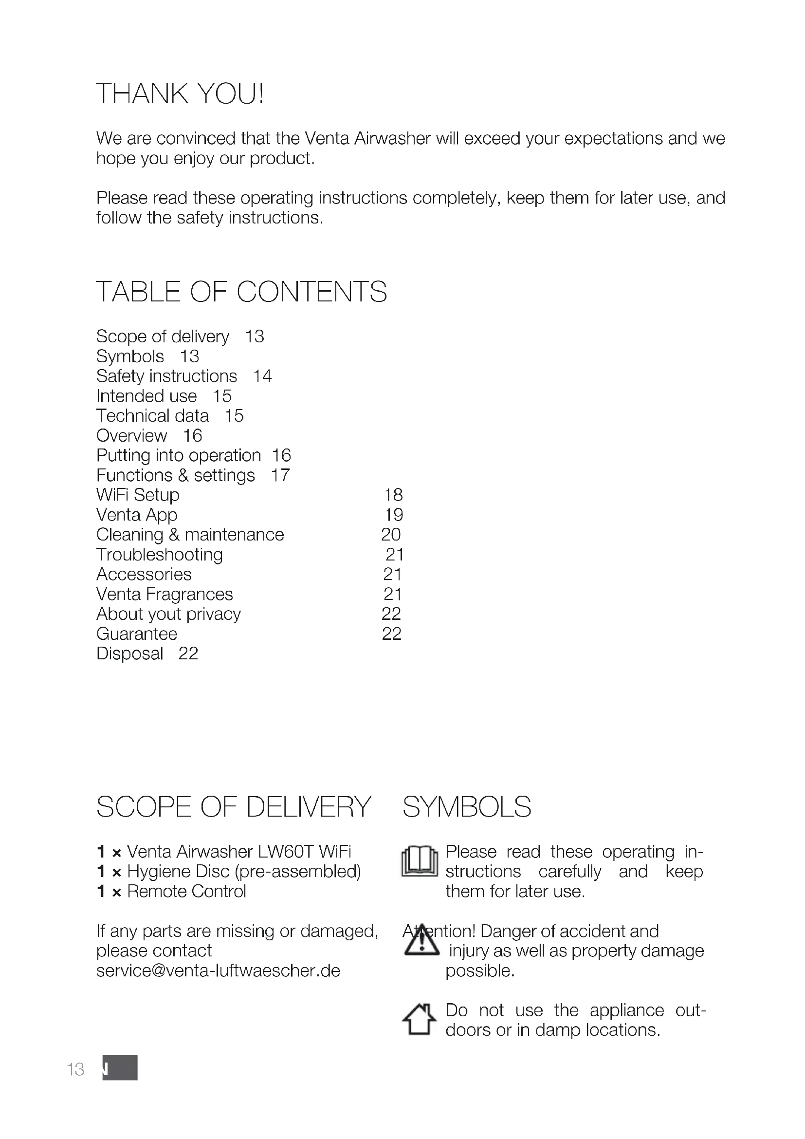 Scope of delivery 13 Symbols 13 Safety instructions 14 Intended use 15 Technical data 15 Overview 16 Putting into operation 16 Functions & settings 17 WiFi Setup 18 Venta App 19 Cleaning & maintenance 20 Troubleshooting 21 Accessories 21 Venta Fragrances 21 About yout privacy 22 Guarantee 22 Disposal 2214ENVenta LW60T WiFi ∙ This appliance is not suitable for use by children over the age of 8 years and people with restricted physical, senso- ry, or mental capacities or lack of ex- perience and knowledge unless they are supervised or have received in- structions on the use of the appliance and understand the existing hazards. ∙ The appliance is not a toy for children. ∙ Cleaning and user maintenance may not be performed by children under the age of 8 years or without supervi- sion. ∙ Keep the appliance and its power ca- ble out of the reach of children under the age of 8 years. ∙ Improper use can damage the appli- ance and cause physical injuries. ∙ Read the operating instructions com- pletely before putting the appliance into operation and keep them for later reference. ∙ Plug the appliance into suitable power outlets only – the mains voltage must correspond to the nameplate data on the appliance. ∙ Disconnect the power plug before every cleaning or maintenance opera- tion or transportation of the appliance. ∙ Never use the Airwasher if it has a damaged power cable. ∙ Spare power cables must conform with the type ‘cold device plug with clover leaf coupling IEC 320 C5’ ∙ Never use the Airwasher if it has been dropped or damaged in any other way. ∙ Electrical appliances should only be repaired by professional specialists. Amateur repairs could result in con- siderable danger to the user. ∙ Do not sit on the appliance and do not place any objects on it. ∙ Do not put any foreign objects into the appliance. ∙ Do not immerse the appliance in water or any other liquid. ∙ Never disconnect the power plug by pulling on the cable or disconnect the power plug from the power supply outlet with wet hands. ∙ The Airwasher should only be oper- ated when it is completely assembled. ∙ Place the Airwasher on a stable sur- face which is at and dry. ∙ Ensure that the appliance is spaced at least 20 cm away from and 50 cm above any other objects, such as fur- niture and walls. ∙ Set up the device so that it cannot be knocked over, and so that no one can trip over it or its cable. ∙ Disconnect the power plug from the power supply outlet when the appli- ance is not in use. ∙ Never cover or block the vents to pre- vent overheating/damage to the appli- ance. ∙ Never overll the Airwasher. ∙ Never transport or overbalance the Airwasher with a lled water basin. ∙ Do not add fragrance oil to the water. This may impair the function of the Hy- giene Disc. ∙ Only use original Venta additives. Venta-Luftwäscher GmbH accepts no liability for damage which may be caused by the use of other additives.