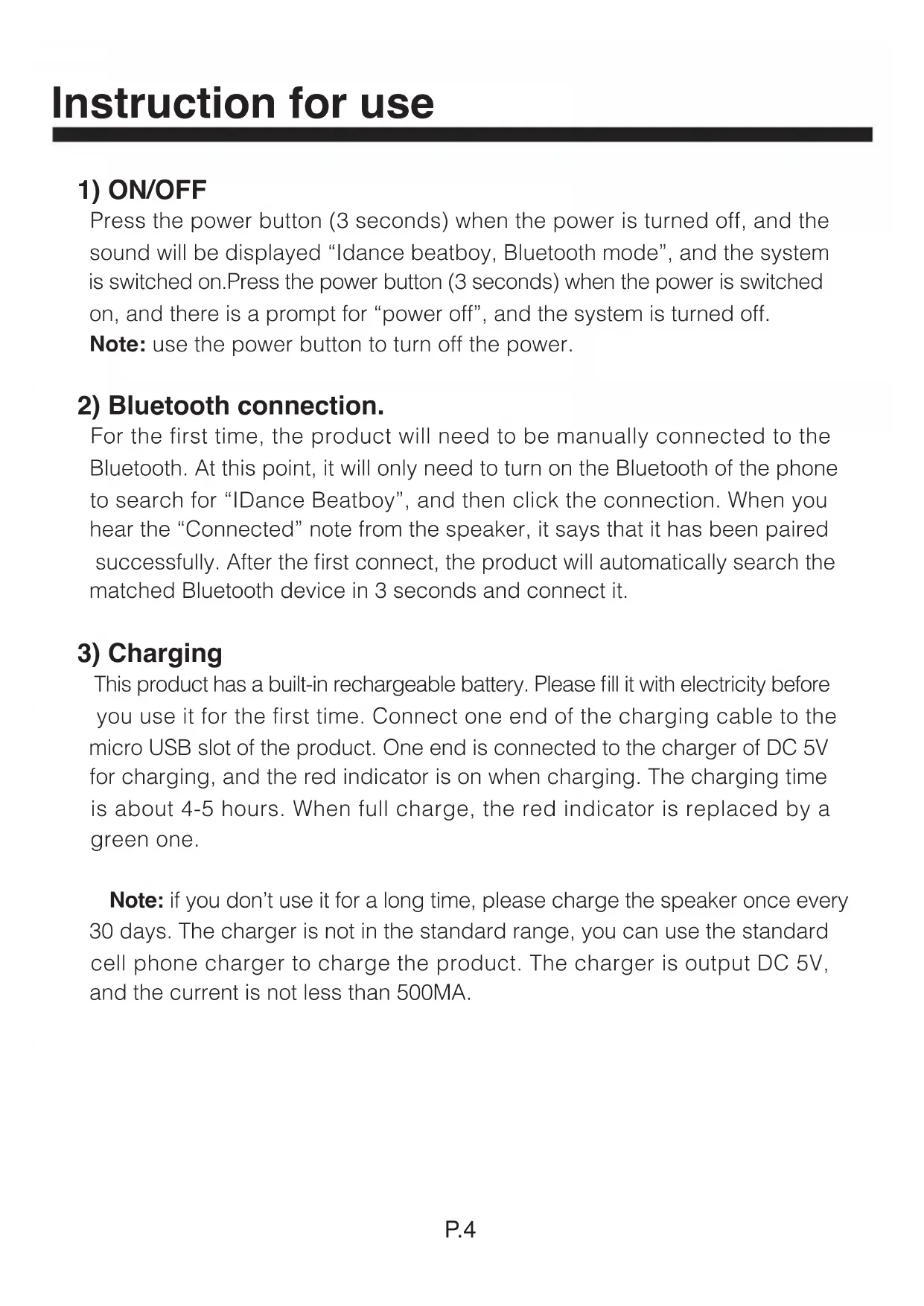 Note: if you don't use it for a long time, please charge the speaker once every 30 days. The charger is not in the standard range, you can use the standard cell phone charger to charge the product. The charger is output DC 5V, and the current is not less than 500MA.
