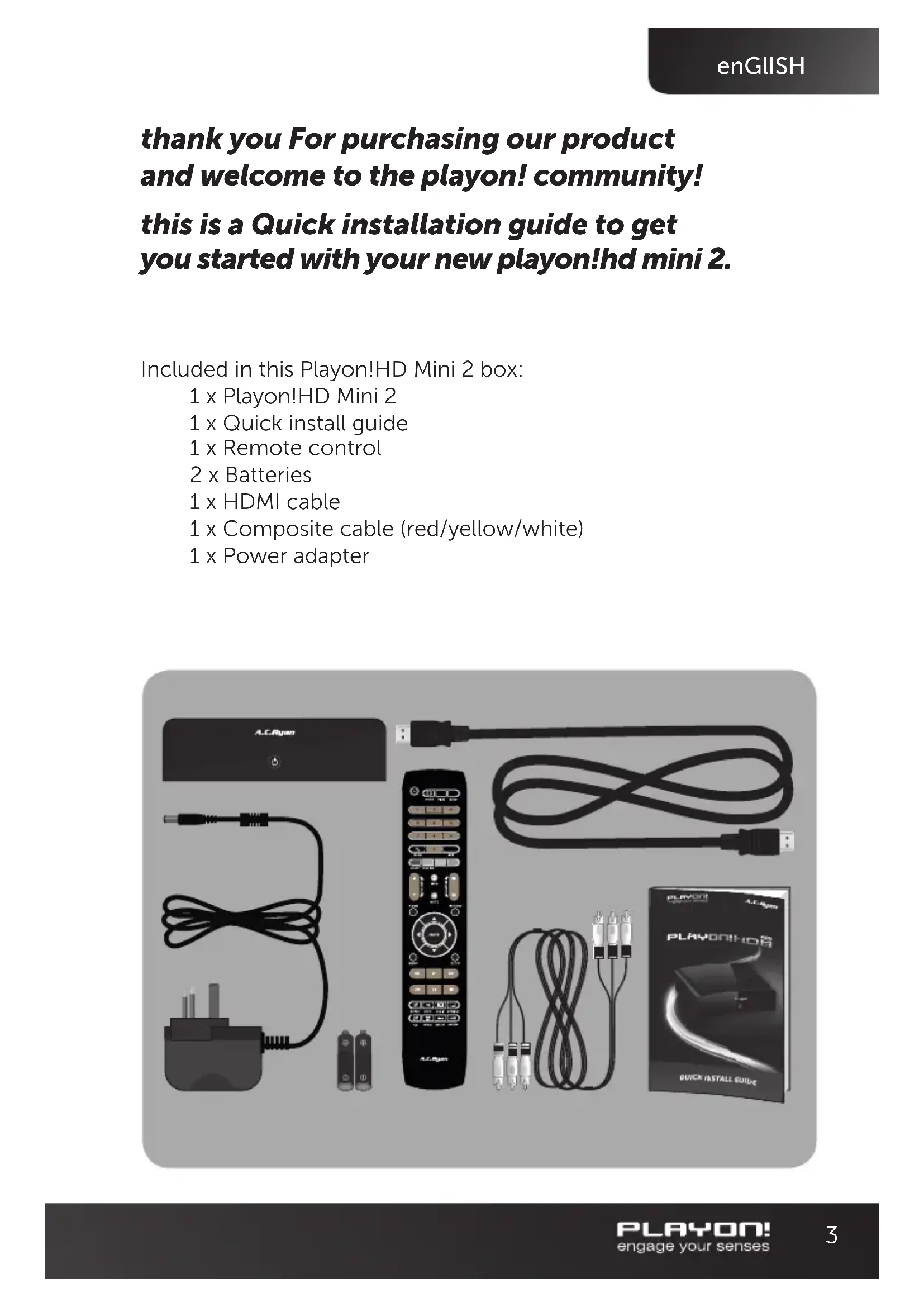enGlISHInitial Setup Choose your: Menu language: Select the language you want to use. Wired set-up: Choose automatic or fixed IP/DNS address if you have a network cable attached. Follow the instructions on the screen. If you don’t have a network cable attached you can skip this step. Once you have done this initial setup, your Playon!HD Mini 2 will be in the main menu and ready to use. Please take your time to go through the Setup menu and personalise the settings that you want to use, then you are ready to use your Playon!HD Mini 2. Playon! Engage your senses. Alternative options: If your TV does not have a HDMI input, you can use the included Composite cable for both video and audio or a component cable (not included) for video and the composite cable (red/white) for audio. If you have an Audio/Video Receiver you can connect your audio/video signals through it to receive audio and video with a HDMI, Composite, Component, SPDIF Optical TOSLINK cable. *** SPDIF Optical TOSLINK cables (not included) supports up to