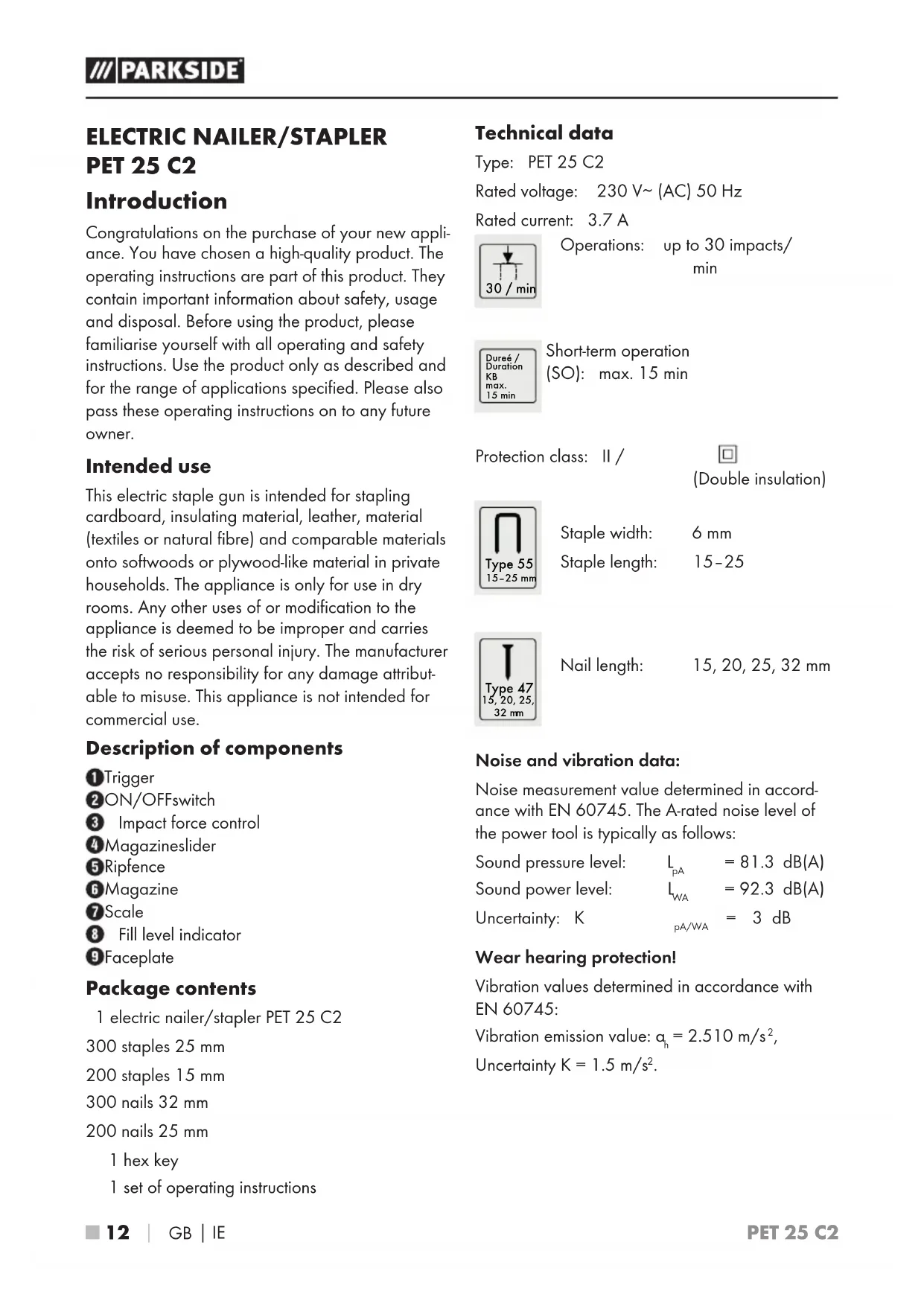 PET 25 C2 Introduction Congratulations on the purchase of your new appli- ance. You have chosen a high-quality product. The operating instructions are part of this product. They contain important information about safety, usage and disposal. Before using the product, please familiarise yourself with all operating and safety instructions. Use the product only as described and for the range of applications specified. Please also pass these operating instructions on to any future owner. Intended use This electric staple gun is intended for stapling cardboard, insulating material, leather, material (textiles or natural fibre) and comparable materials onto softwoods or plywood-like material in private households. The appliance is only for use in dry rooms. Any other uses of or modification to the appliance is deemed to be improper and carries the risk of serious personal injury. The manufacturer accepts no responsibility for any damage attribut- able to misuse. This appliance is not intended for commercial use. Description of components Trigger ON/OFF switch Impact force control Magazine slider Rip fence Magazine Scale Fill level indicator Face plate Package contents 1 electric nailer/stapler PET 25 C2 300 staples 25 mm 200 staples 15 mm 300 nails 32 mm 200 nails 25 mm 1 hex key 1 set of operating instructions Technical data Type: PET 25 C2 Rated voltage: 230 V∼ (AC) 50 Hz Rated current: 3.7 A 30 / min Operations: up to 30 impacts/ min Dureé / Duration