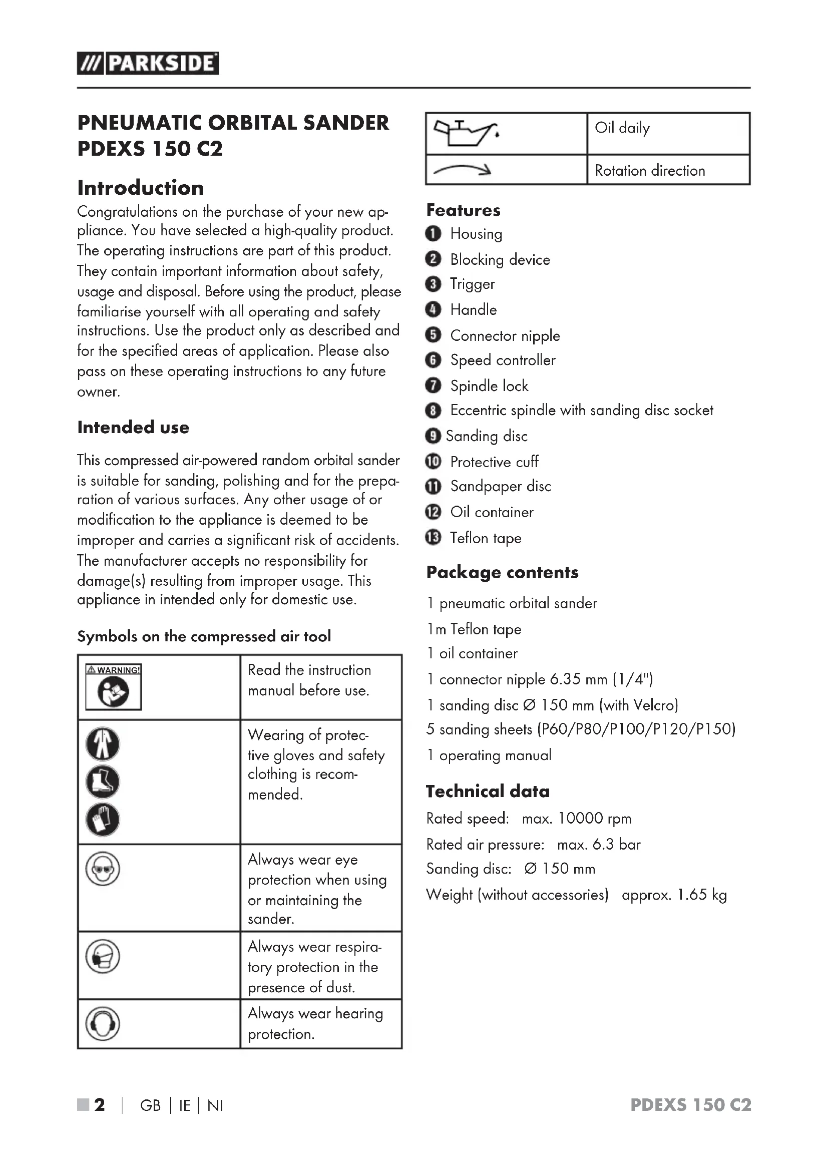 PDEXS 150 C2 Introduction Congratulations on the purchase of your new ap- pliance. You have selected a high-quality product. The operating instructions are part of this product. They contain important information about safety, usage and disposal. Before using the product, please familiarise yourself with all operating and safety instructions. Use the product only as described and for the specified areas of application. Please also pass on these operating instructions to any future owner. Intended use This compressed air-powered random orbital sander is suitable for sanding, polishing and for the prepa- ration of various surfaces. Any other usage of or modification to the appliance is deemed to be improper and carries a significant risk of accidents. The manufacturer accepts no responsibility for damage(s) resulting from improper usage. This appliance in intended only for domestic use. Symbols on the compressed air tool WARNING! Read the instruction manual before use. Wearing of protec- tive gloves and safety clothing is recom- mended. Always wear eye protection when using or maintaining the sander. Always wear respira- tory protection in the presence of dust. Always wear hearing protection. Oil daily Rotation direction Features Housing Blocking device Trigger Handle Connector nipple Speed controller Spindle lock Eccentric spindle with sanding disc socket Sanding disc Protective cuff Sandpaper disc Oil container Teflon tape Package contents 1 pneumatic orbital sander 1m Teflon tape 1 oil container 1 connector nipple 6.35 mm (1/4") 1 sanding disc Ø 150 mm (with Velcro) 5 sanding sheets (P60/P80/P100/P120/P150) 1 operating manual Technical data Rated speed: max. 10000 rpm Rated air pressure: max. 6.3 bar Sanding disc: Ø 150 mm Weight (without accessories) approx. 1.65 kgPDEXS 150 C2