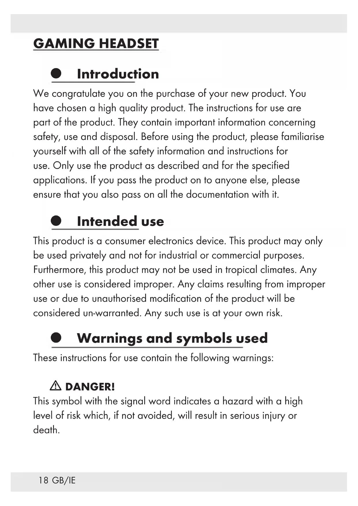 is a registered trademark of USB Implementers Forum, Inc. The SilverCrest trademark and trade name is the property of their respective owners. Any other names and products may be trademarks or registered trademarks of their respective owners. Scope of delivery 1 Gaming headset 1 Instructions for use20 GB/IE Safety instructions Before using the product, please familiarize yourself with all of the safety instructions and instructions for use! When passing this product on to others, please also include all the documents! m WARNING! DANGER TO LIFE AND RISK OF ACCIDENT FOR INFANTS AND CHILDREN! m DANGER! RISK OF SUFFOCATION! Never leave children unsupervised with the packaging material. The packaging material poses a suffocation hazard. Children frequently underestimate the dangers. The packaging material is not a toy. This product may be used by children age 8 years and up, as well as by persons with reduced physical, sensory or mental capacities or lacking experience and/or knowledge, so long as they are supervised or instructed in the safe use of the product and understand the associated risks. Do not allow children to play with the product. Cleaning and user maintenance should not be performed by children without supervision. The product is not a toy.