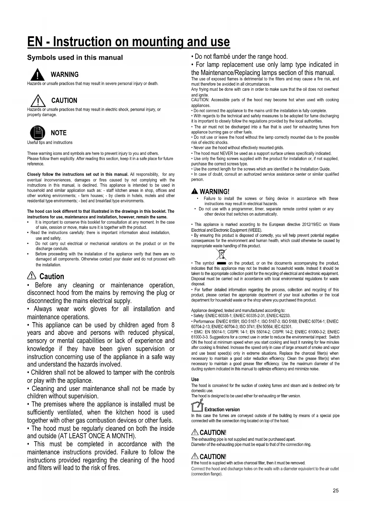 - EMC: EN 55014-1; CISPR 14-1; EN 55014-2; CISPR 14-2; EN/IEC 61000-3-2; EN/IEC 61000-3-3. Suggestions for a correct use in order to reduce the environmental impact: Switch ON the hood at minimum speed when you start cooking and kept it running for few minutes after cooking is finished. Increase the speed only in case of large amount of smoke and vapor and use boost speed(s) only in extreme situations. Replace the charcoal filter(s) when necessary to maintain a good odor reduction efficiency. Clean the grease filter(s) when necessary to maintain a good grease filter efficiency. Use the maximum diameter of the ducting system indicated in this manual to optimize efficiency and minimize noise. Use The hood is conceived for the suction of cooking fumes and steam and is destined only for domestic use. The hood is designed to be used either for exhausting or filter version. Extraction version In this case the fumes are conveyed outside of the building by means of a special pipe connected with the connection ring located on top of the hood. CAUTION! The exhausting pipe is not supplied and must be purchased apart. Diameter of the exhausting pipe must be equal to that of the connection ring. CAUTION! If the hood is supplied with active charcoal filter, then it must be removed. Connect the hood and discharge holes on the walls with a diameter equivalent to the air outlet (connection flange).26 Using the tubes and discharge holes on walls with smaller dimensions will cause a diminution of the suction performance and a drastic increase in noise. Any responsibility in the matter is therefore declined. ! Use a duct of the minimum indispensable length. ! Use a duct with as few elbows as possible (maximum elbow angle: 90°). ! Avoid drastic changes in the duct cross-section. Filtration version The aspirated air will be degreased and deodorised before being fed back into the room. In order to use the hood in this version, you have to install a system of additional filtering based on activated charcoal.