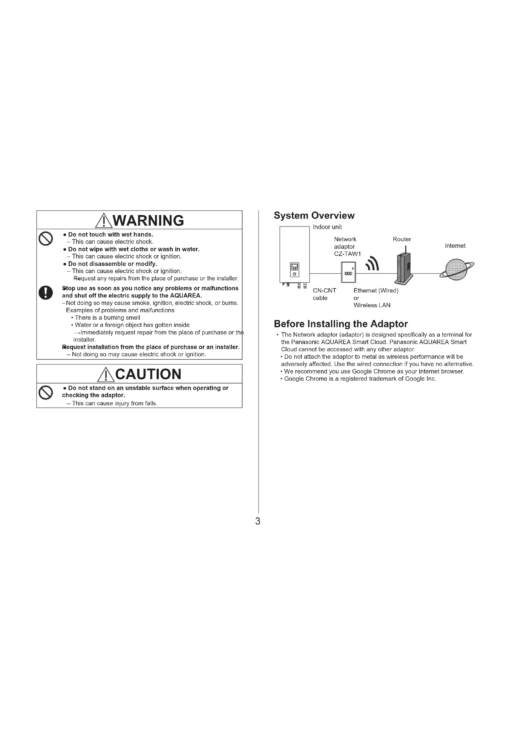 Request installation from the place of purchase or an installer – Not doing so may cause electric shock or ignition. CAUTION ● Do not stand on an unstable surface when operating or checking the adaptor – This can cause injury from falls. System Overview Indoor unit Network adaptor CZ‑TAW1 Router Internet CN‑CNT cable Ethernet (Wired)