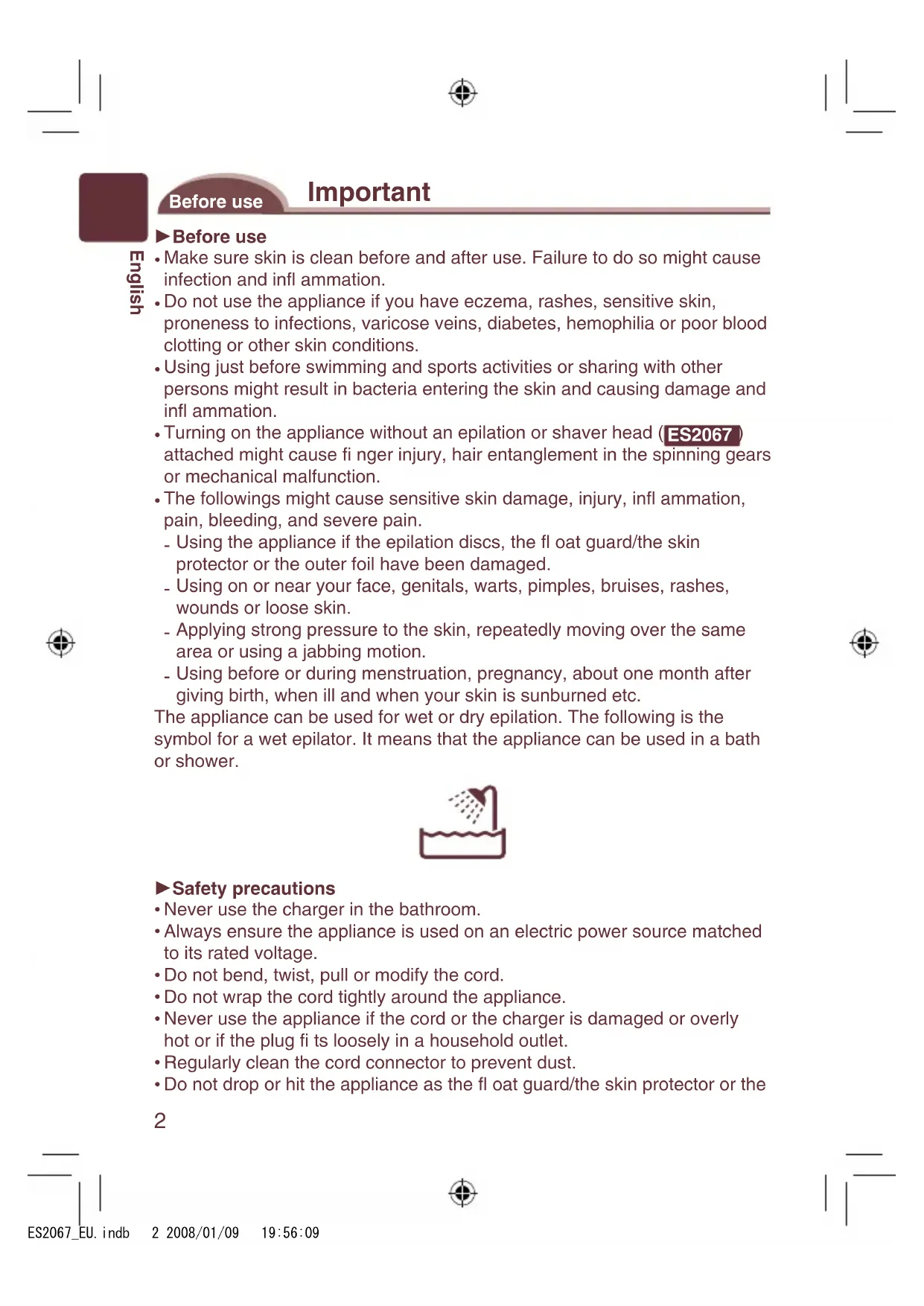 attached might cause fi nger injury, hair entanglement in the spinning gears or mechanical malfunction. The followings might cause sensitive skin damage, injury, infl ammation, pain, bleeding, and severe pain. Using the appliance if the epilation discs, the fl oat guard/the skin protector or the outer foil have been damaged. Using on or near your face, genitals, warts, pimples, bruises, rashes, wounds or loose skin. Applying strong pressure to the skin, repeatedly moving over the same area or using a jabbing motion. Using before or during menstruation, pregnancy, about one month after giving birth, when ill and when your skin is sunburned etc. The appliance can be used for wet or dry epilation. The following is the symbol for a wet epilator. It means that the appliance can be used in a bath or shower. Safety precautions Never use the charger in the bathroom. Always ensure the appliance is used on an electric power source matched to its rated voltage. Do not bend, twist, pull or modify the cord. Do not wrap the cord tightly around the appliance. Never use the appliance if the cord or the charger is damaged or overly hot or if the plug fi ts loosely in a household outlet. Regularly clean the cord connector to prevent dust. Do not drop or hit the appliance as the fl oat guard/the skin protector or the