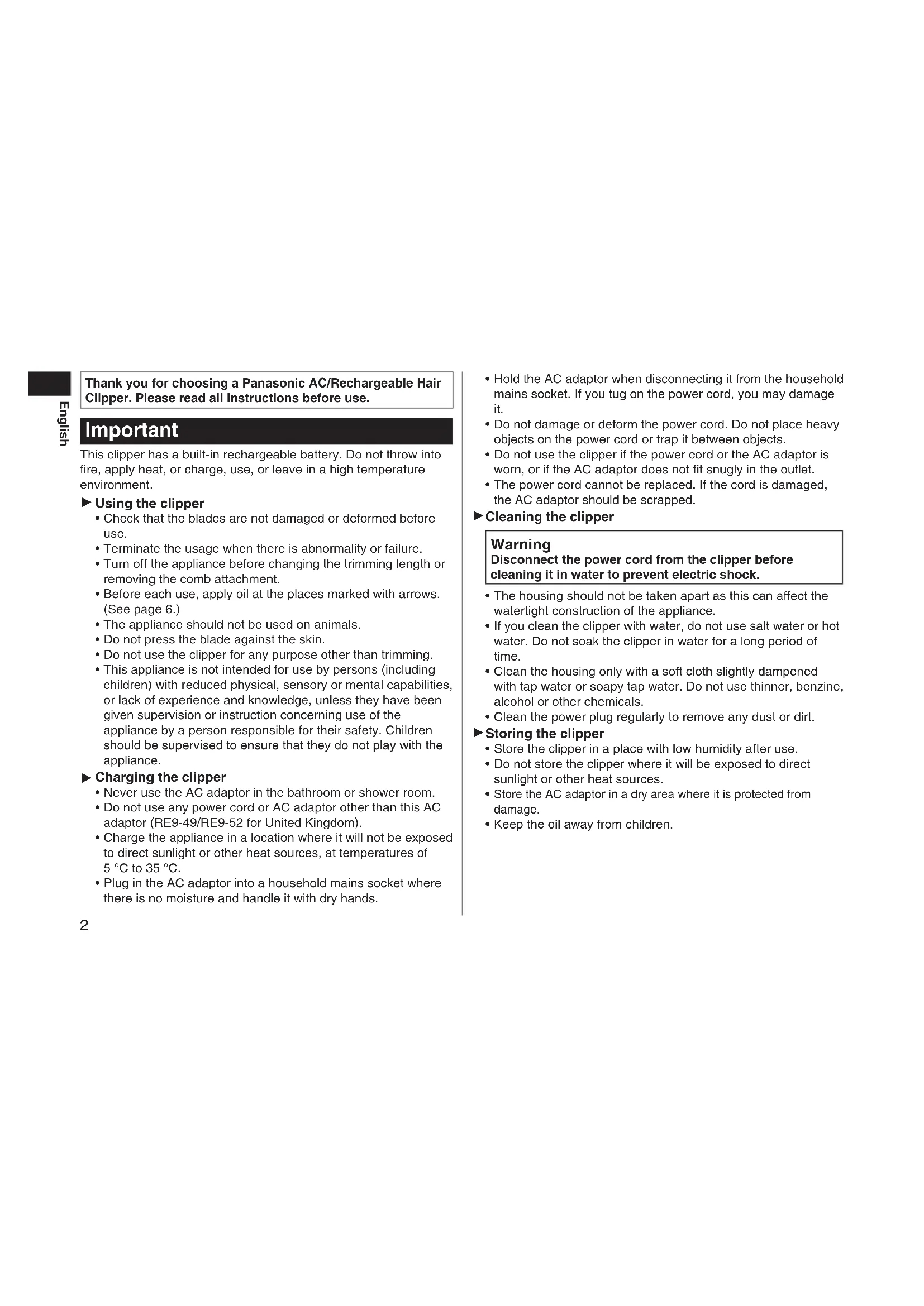 Hold the AC adaptor when disconnecting it from the household mains socket. If you tug on the power cord, you may damage it. Do not damage or deform the power cord. Do not place heavy objects on the power cord or trap it between objects. Do not use the clipper if the power cord or the AC adaptor is worn, or if the AC adaptor does not fit snugly in the outlet. The power cord cannot be replaced. If the cord is damaged, the AC adaptor should be scrapped. Cleaning the clipper Warning Disconnect the power cord from the clipper before cleaning it in water to prevent electric shock. The housing should not be taken apart as this can affect the watertight construction of the appliance. If you clean the clipper with water, do not use salt water or hot water. Do not soak the clipper in water for a long period of time. Clean the housing only with a soft cloth slightly dampened with tap water or soapy tap water. Do not use thinner, benzine, alcohol or other chemicals. Clean the power plug regularly to remove any dust or dirt. Storing the clipper Store the clipper in a place with low humidity after use. Do not store the clipper where it will be exposed to direct sunlight or other heat sources. Store the AC adaptor in a dry area where it is protected from damage. Keep the oil away from children.