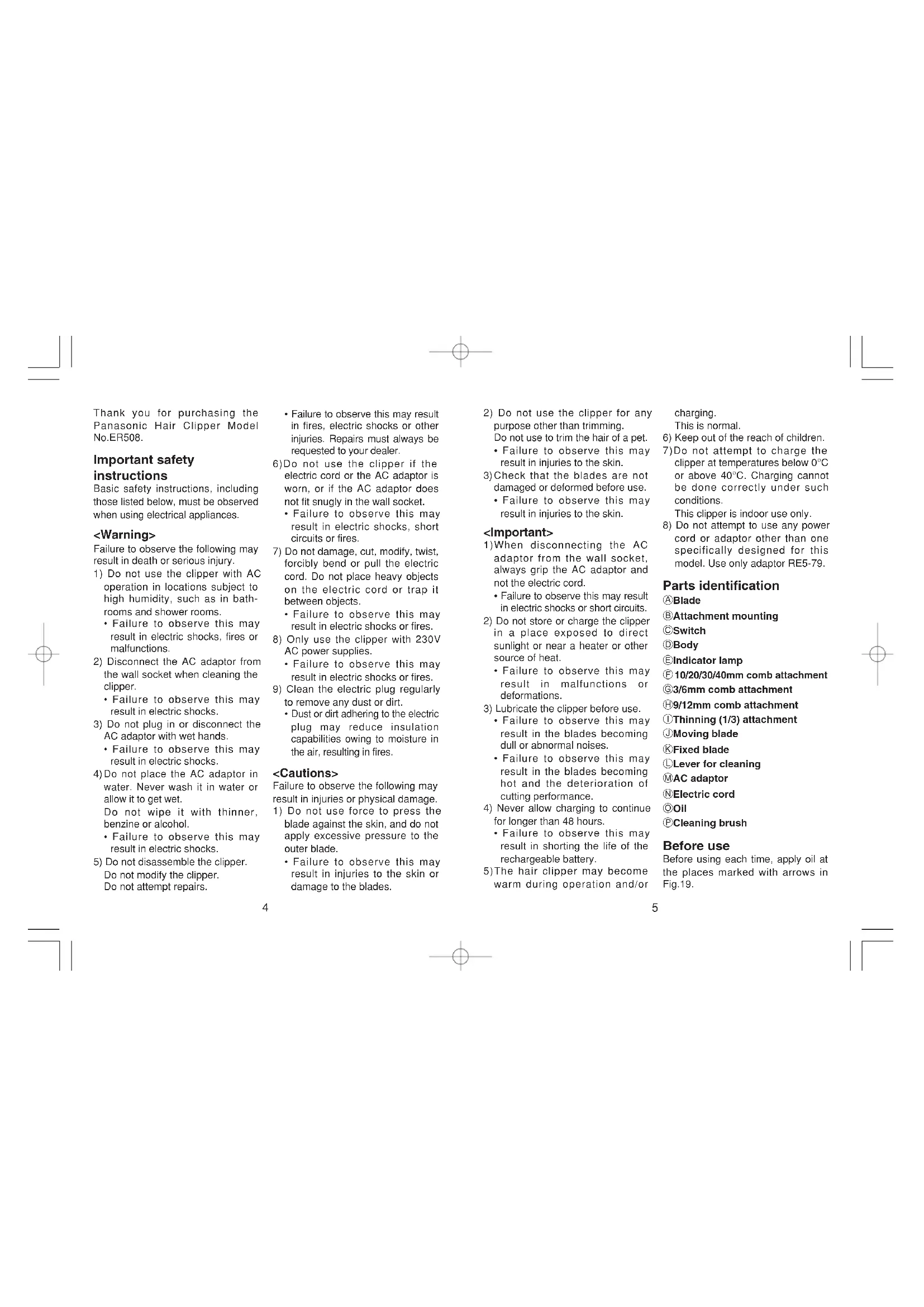 R4 5 Thank you for purchasing the Panasonic Hair Clipper Model No.ER508. Important safety instructions Basic safety instructions, including those listed below, must be observed when using electrical appliances. <Warning> Failure to observe the following may result in death or serious injury.