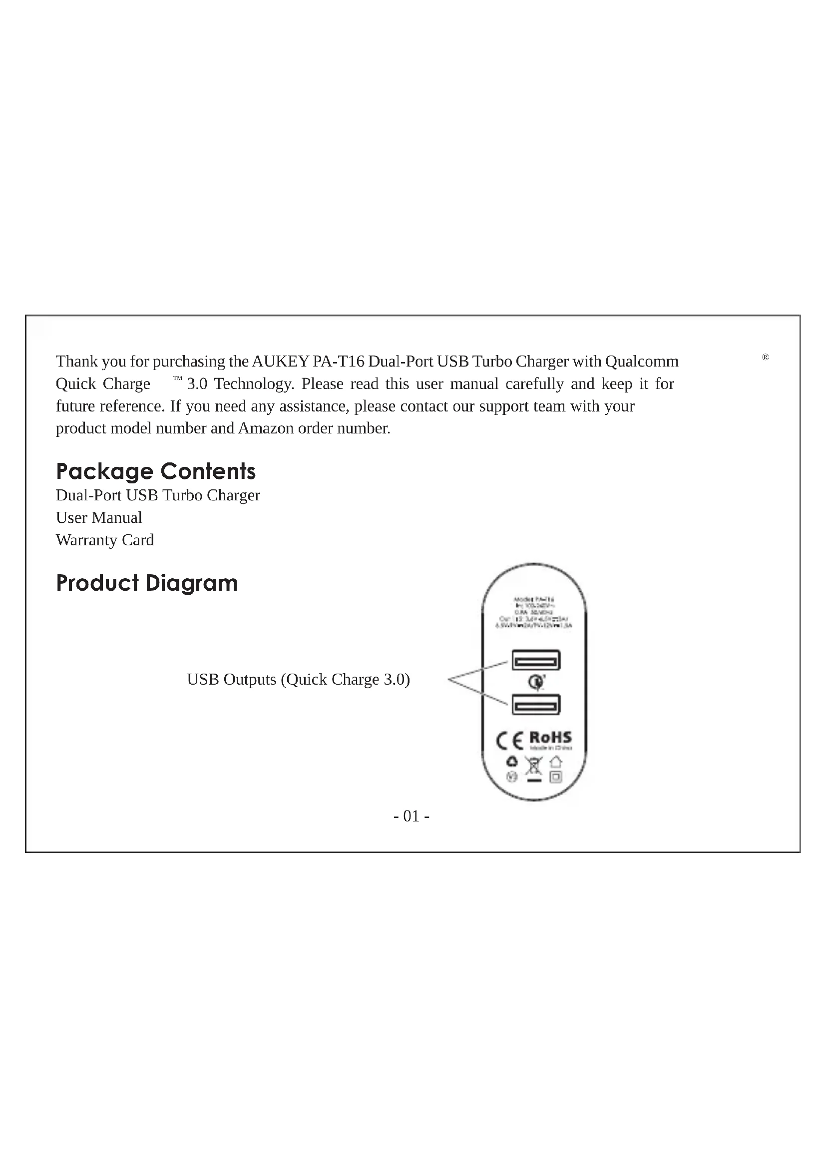 Q & A How do I know if my device is Quick Charge 3.0 compatible? For a complete list of Quick Charge-compatible devices, please visit Qualcomm's website: www.qualcomm.com Can I use the PA-T16 Quick Charge 3.0 ports with devices that don’t support Quick Charge? Yes. Quick Charge 3.0 supports multi-voltage output. You can use the PA-T16 to charge any USB-powered device, but charging speeds will be limited by original device manufacturer’s specifications (e.g. you can charge an iPhone, but can’t Quick Charge an iPhone). Product Care ● Keep away from liquids and extreme heat Warranty & Customer Support For questions, support, or warranty claims, please contact us at the address below that corresponds with your region. Please include your Amazon order number and product model number. Amazon US orders: support.us@aukey.com Amazon EU orders: support.eu@aukey.com Amazon CA orders: support.ca@aukey.com Amazon JP orders: support.jp@aukey.com *Please note, AUKEY can only provide after sales service for products purchased directly from AUKEY. If you have purchased from a different seller, please contact them directly for service or warranty issues.- 03 - Getting Started