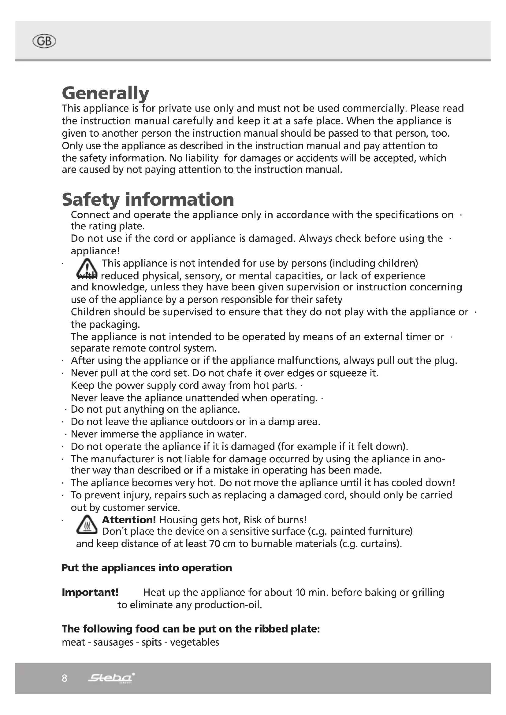- Kunststoffverpackungsteile und Folien sollten ebenfalls in die dafür vorgesehenen ∙ Sammelbehälter gegeben werden ∙ In den Beispielen für die Kunststoffkennzeichnung steht: PE für Polyethylen, die Kennziffer 02 für PE-HD, 04 für PE-LD, PP für Polypropylen, PS für Polystürol. Kundenservice: Sollte Ihr Gerät wider Erwarten einmal den Kundendienst benötigen, wenden Sie sich bitte an nachfolgende Anschrift. Wir werden dann im Garantiefall die Abholung veranlassen. Das Gerät muss transportfähig verpackt sein. Unfreie Pakete können nicht angenommen werden! STEBA Elektrogeräte GmbH & Co KG Pointstr. 2, 96129 Strullendorf / Germany Vertrieb-Tel.: 09543 / 449-17 / -18, Service-Tel.: 09543 / 449-44, Fax: 09543 / 449-19 e-Mail: elektro@steba.com Internet: http://www.steba.com Achtung! Elektrogeräte dürfen nur durch Elektro-Fachkräfte repariert werden, da durch unsachgemäße Reparaturen erhebliche Folgeschäden entstehen können. 480-13220 - RC28 - 06-2011.indd 6 01.07.2011 14:57:037 480-13220 - RC28 - 06-2011.indd 7 01.07.2011 14:57:038 Generally This appliance is for private use only and must not be used commercially. Please read the instruction manual carefully and keep it at a safe place. When the appliance is given to another person the instruction manual should be passed to that person, too. Only use the appliance as described in the instruction manual and pay attention to the safety information. No liability for damages or accidents will be accepted, which are caused by not paying attention to the instruction manual. Safety information Connect and operate the appliance only in accordance with the specifications on ∙ the rating plate. Do not use if the cord or appliance is damaged. Always check before using the ∙ appliance! ∙ This appliance is not intended for use by persons (including children) with reduced physical, sensory, or mental capacities, or lack of experience and knowledge, unless they have been given supervision or instruction concerning use of the appliance by a person responsible for their safety Children should be supervised to ensure that they do not play with the appliance or ∙ the packaging. The appliance is not intended to be operated by means of an external timer or ∙ separate remote control system. After using the appliance or if the appliance malfunctions, always pull out the plug. ∙ Never pull at the cord set. Do not chafe it over edges or squeeze it. ∙ Keep the power supply cord away from hot parts. ∙ Never leave the apliance unattended when operating. ∙ Do not put anything on the apliance. ∙ Do not leave the apliance outdoors or in a damp area. ∙ Never immerse the appliance in water. ∙ Do not operate the apliance if it is damaged (for example if it felt down). ∙ The manufacturer is not liable for damage occurred by using the apliance in ano- ∙ ther way than described or if a mistake in operating has been made. The apliance becomes very hot. Do not move the apliance until it has cooled down! ∙ To prevent injury, repairs such as replacing a damaged cord, should only be carried ∙ out by customer service. ∙ Attention! Housing gets hot, Risk of burns! Don´t place the device on a sensitive surface (c.g. painted furniture) and keep distance of at least 70 cm to burnable materials (c.g. curtains). Put the appliances into operation Important! Heat up the appliance for about 10 min. before baking or grilling to eliminate any production-oil. The following food can be put on the ribbed plate: meat - sausages - spits - vegetables 480-13220 - RC28 - 06-2011.indd 8 01.07.2011 14:57:059