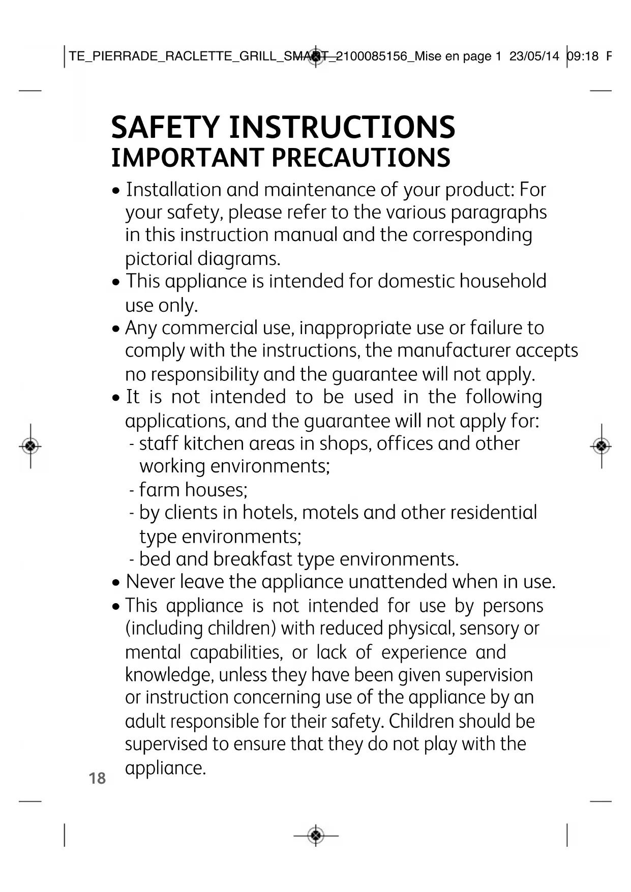 TE_PIERRADE_RACLETTE_GRILL_SMART_2100085156_Mise en page 1 23/05/14 09:18 Page19under the age of 8 years should not use this appliance unless continuous supervision by a responsible adult is given. Cleaning and user maintenance shall not be made by children unless they are older than 8 years and supervised.