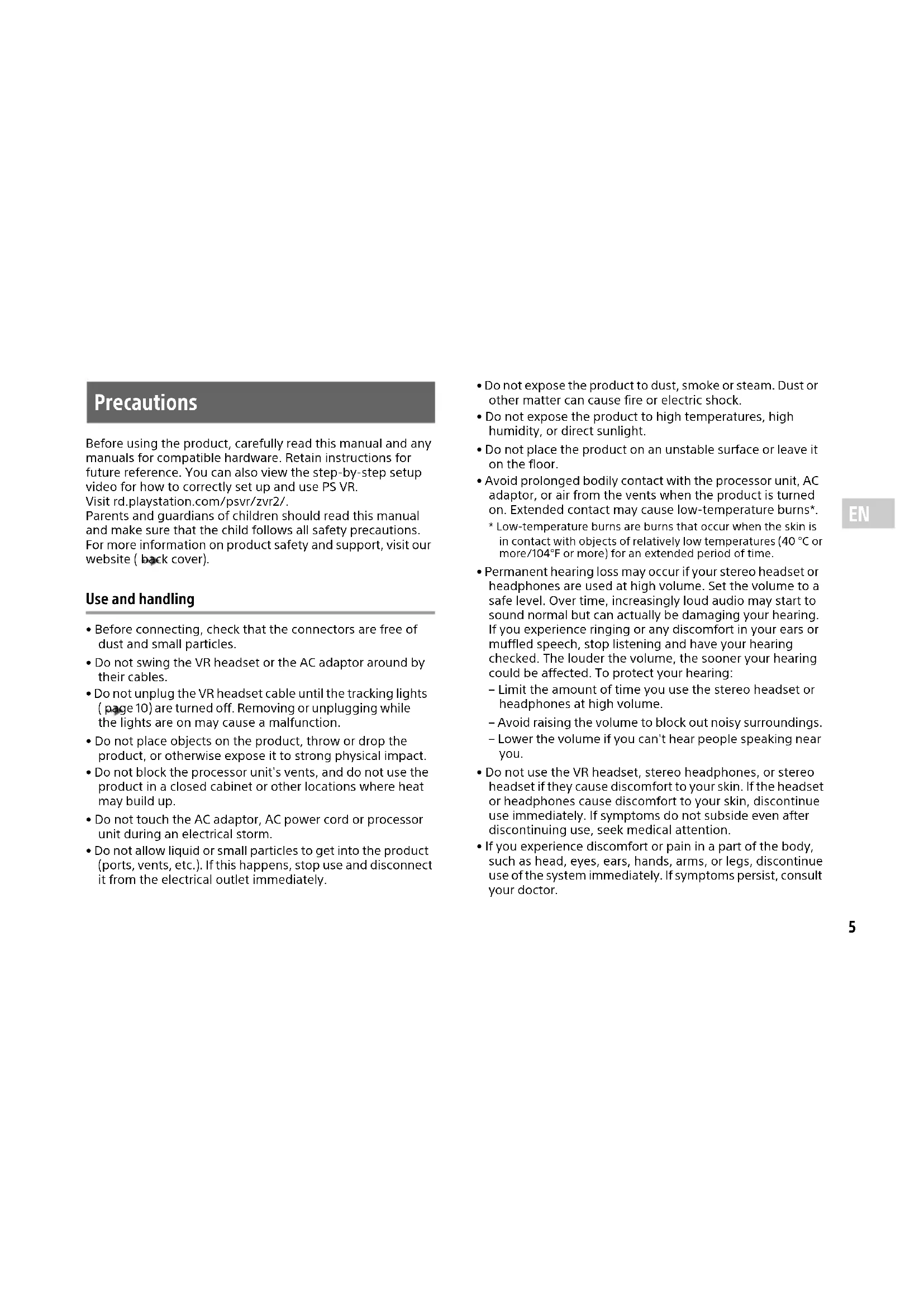 Before using the product, carefully read this manual and any manuals for compatible hardware. Retain instructions for future reference. You can also view the step-by-step setup video for how to correctly set up and use PS VR. Visit rd.playstation.com/psvr/zvr2/. Parents and guardians of children should read this manual and make sure that the child follows all safety precautions. For more information on product safety and support, visit our website ( back cover). Use and handling