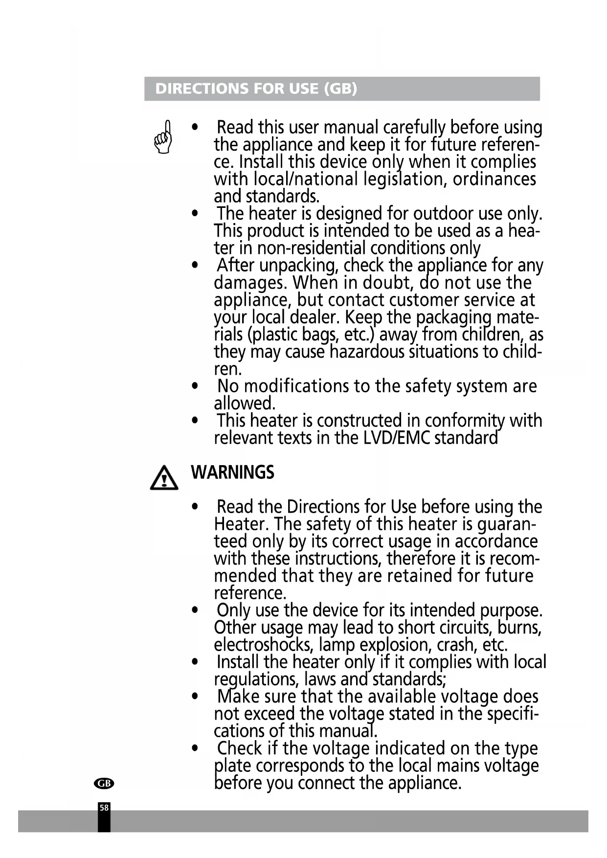 - Read the Directions for Use before using the Heater. The safety of this heater is guaran- teed only by its correct usage in accordance with these instructions, therefore it is recom- mended that they are retained for future reference.