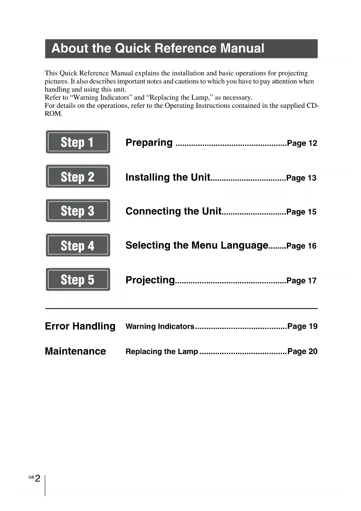 This Quick Reference Manual explains the installation and basic operations for projecting pictures. It also describes important notes and cautions to which you have to pay attention when handling and using this unit.Refer to “Warning Indicators” and “Replacing the Lamp,” as necessary.For details on the operations, refer to the Operating Instructions contained in the supplied CD- ROM. About the Quick Reference Manual Preparing ..................................................Page 12 Installing the Unit..................................Page 13 Connecting the Unit.............................Page 15 Selecting the Menu Language........Page 16 Projecting..................................................Page 17 Error Handling Warning Indicators.........................................Page 19 Maintenance Replacing the Lamp .......................................Page 20 Step 1 Step 2 Step 3 Step 4 Step 53