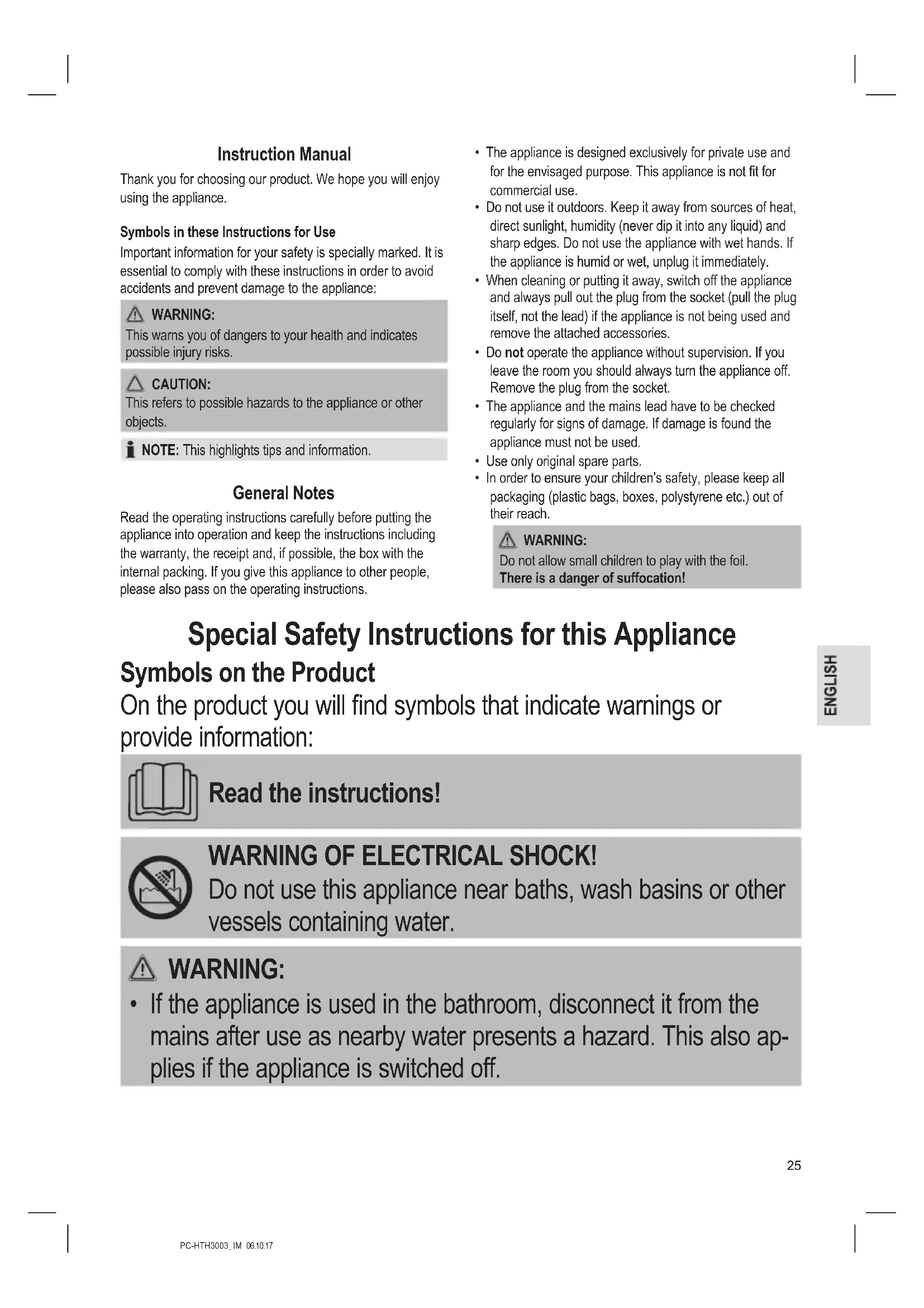 Do not allow small children to play with the foil. There is a danger of suffocation! Special Safety Instructions for this Appliance Symbols on the Product On the product you will nd symbols that indicate warnings or provide information: Read the instructions! WARNING OF ELECTRICAL SHOCK! Do not use this appliance near baths, wash basins or other vessels containing water.