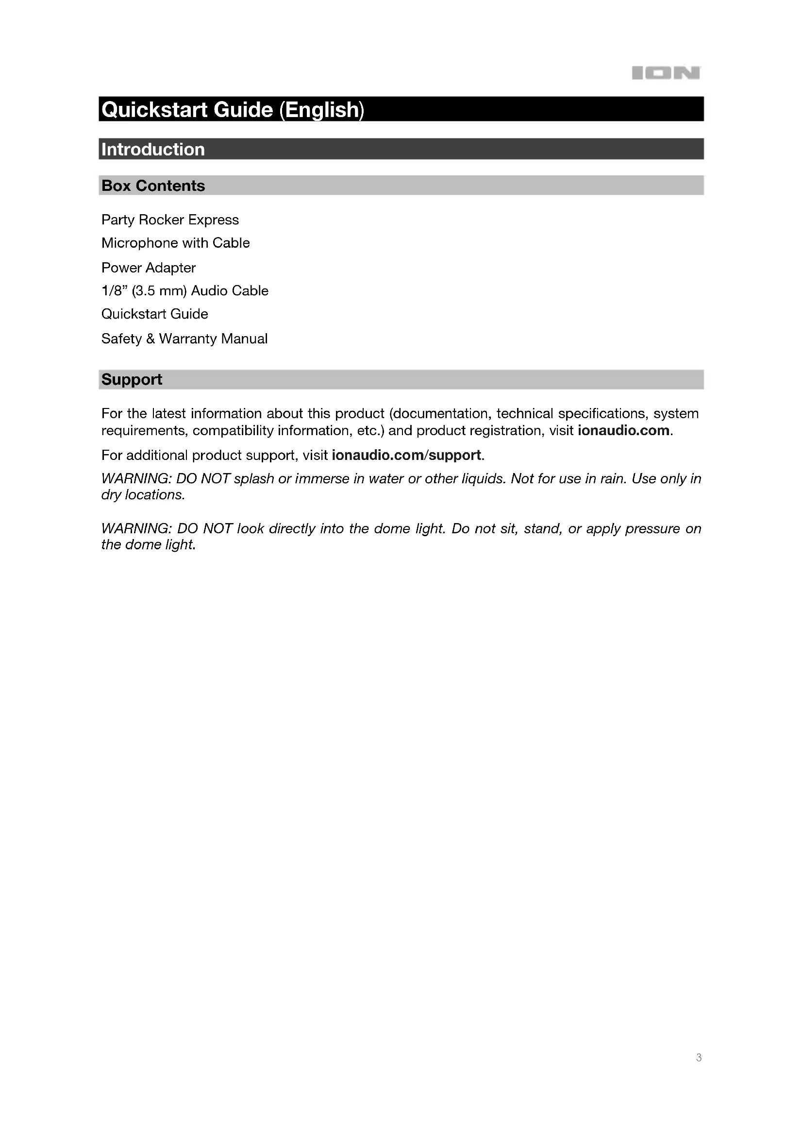 Quickstart Guide (English) Introduction Box Contents Party Rocker Express Microphone with Cable Power Adapter 1/8” (3.5 mm) Audio Cable Quickstart Guide Safety & Warranty Manual Support For the latest information about this product (documentation, technical specifications, system requirements, compatibility information, etc.) and product registration, visit ionaudio.com. For additional product support, visit ionaudio.com/support.