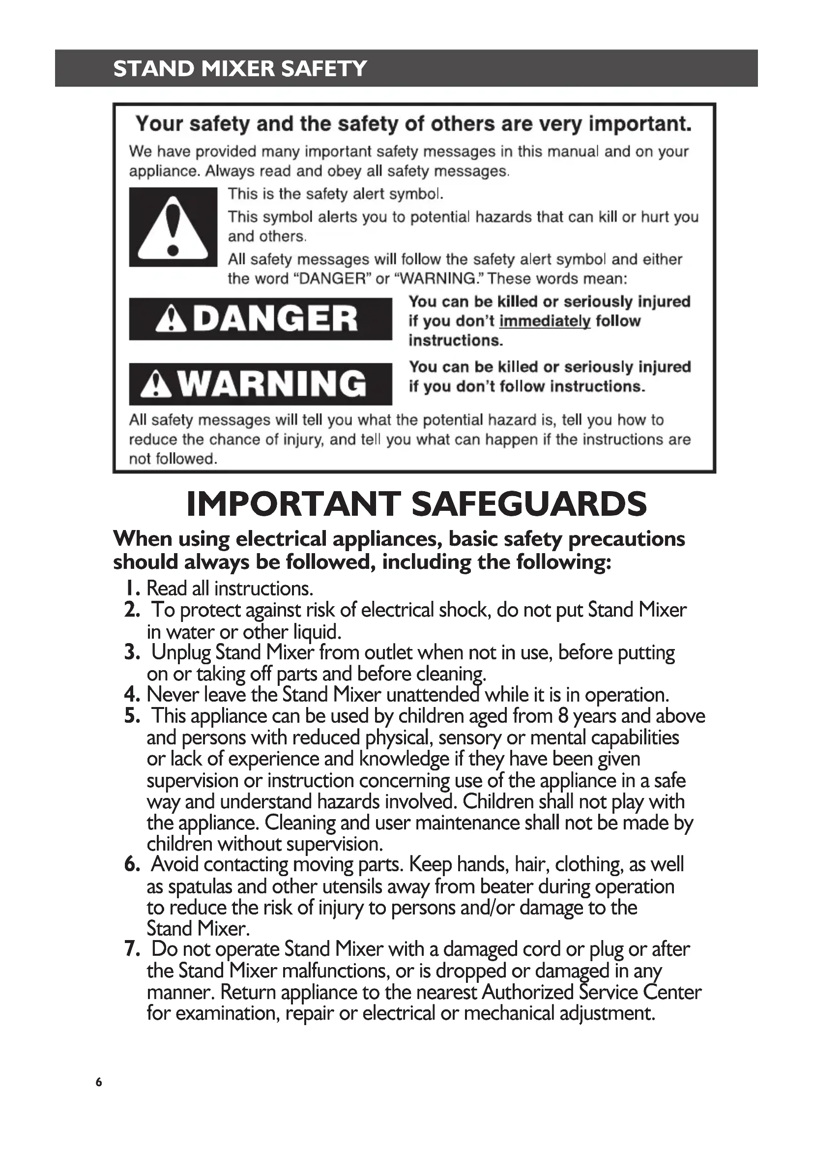 7. Do not operate Stand Mixer with a damaged cord or plug or after